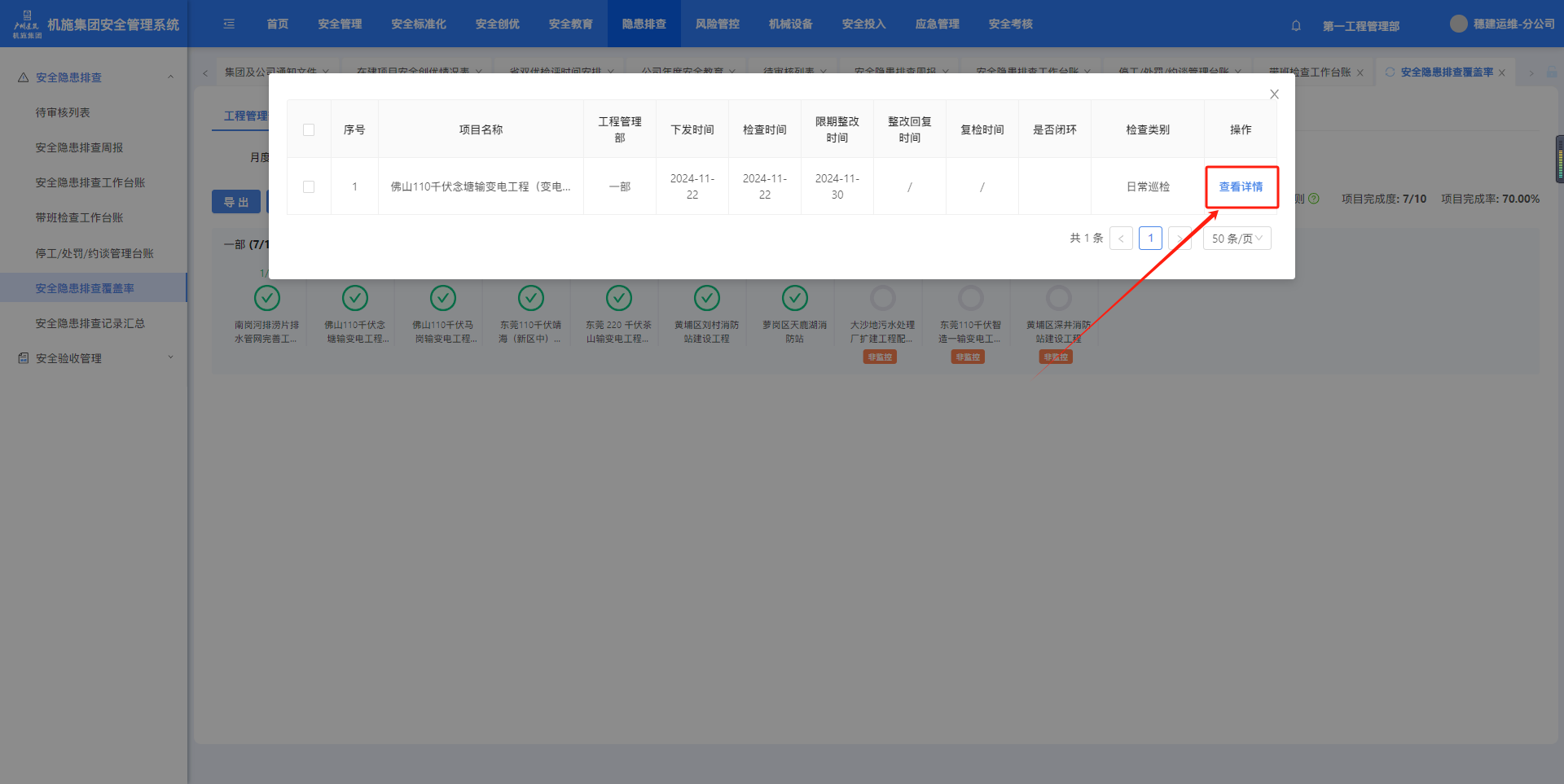 点击项目名可展开详情,点击“查看详情”会跳转到安全隐患排查工作台账。