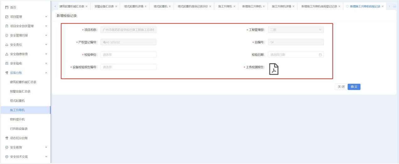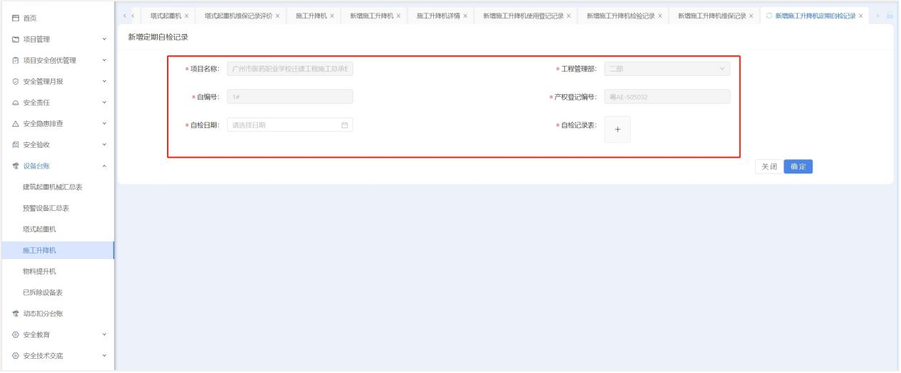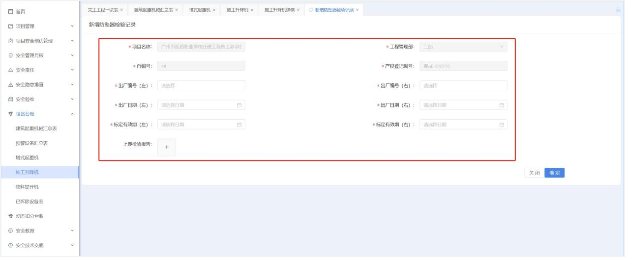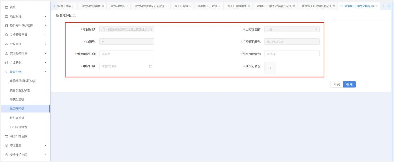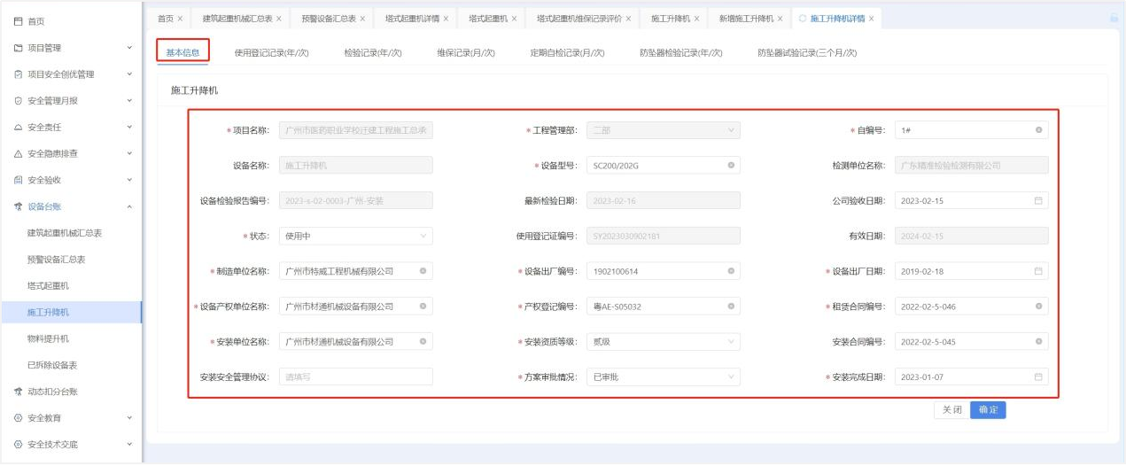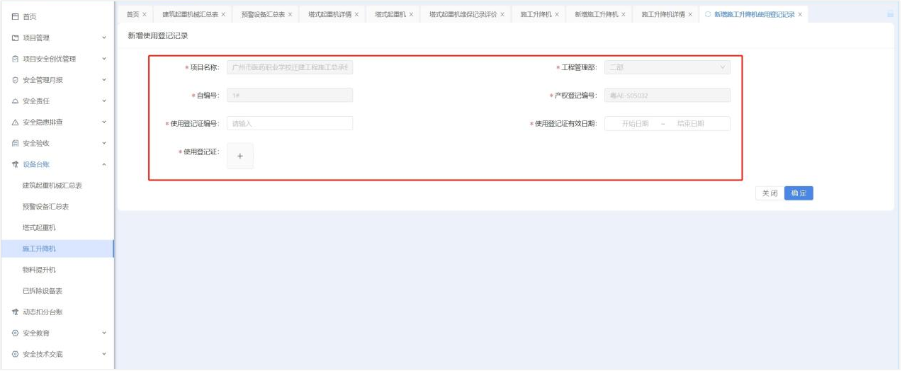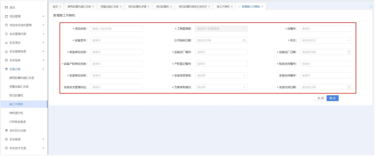 点击【新增】进入施工升降机新增页面,填写完内容点击【确定】新增。