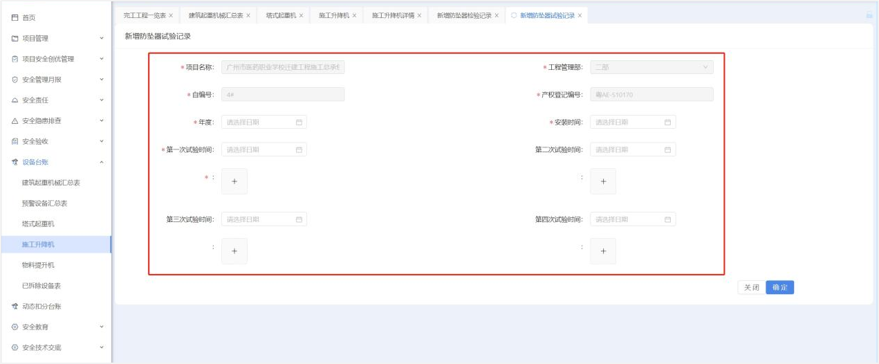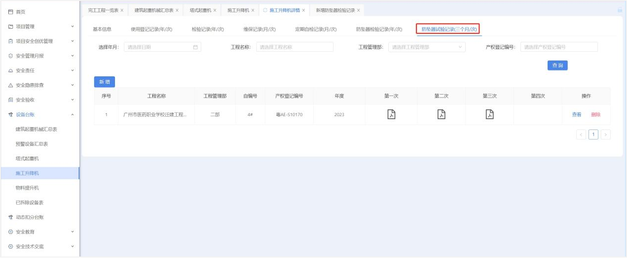 点击【新增】进入新增防坠器试验记录(三个月/次)。