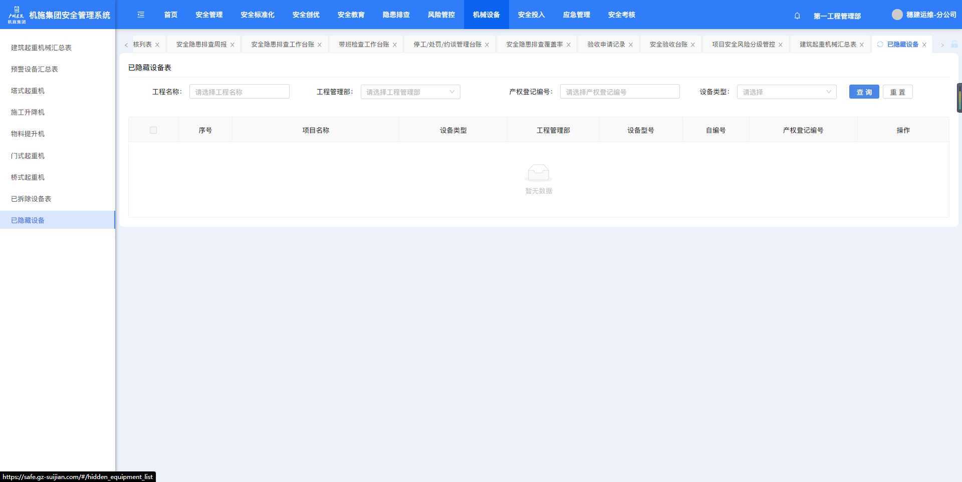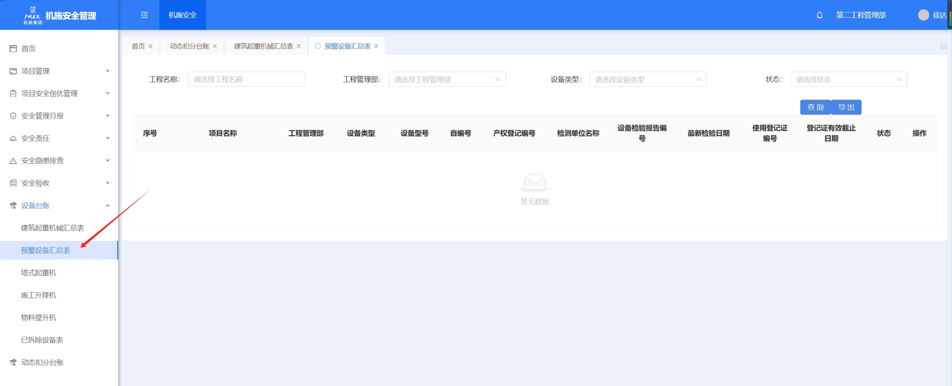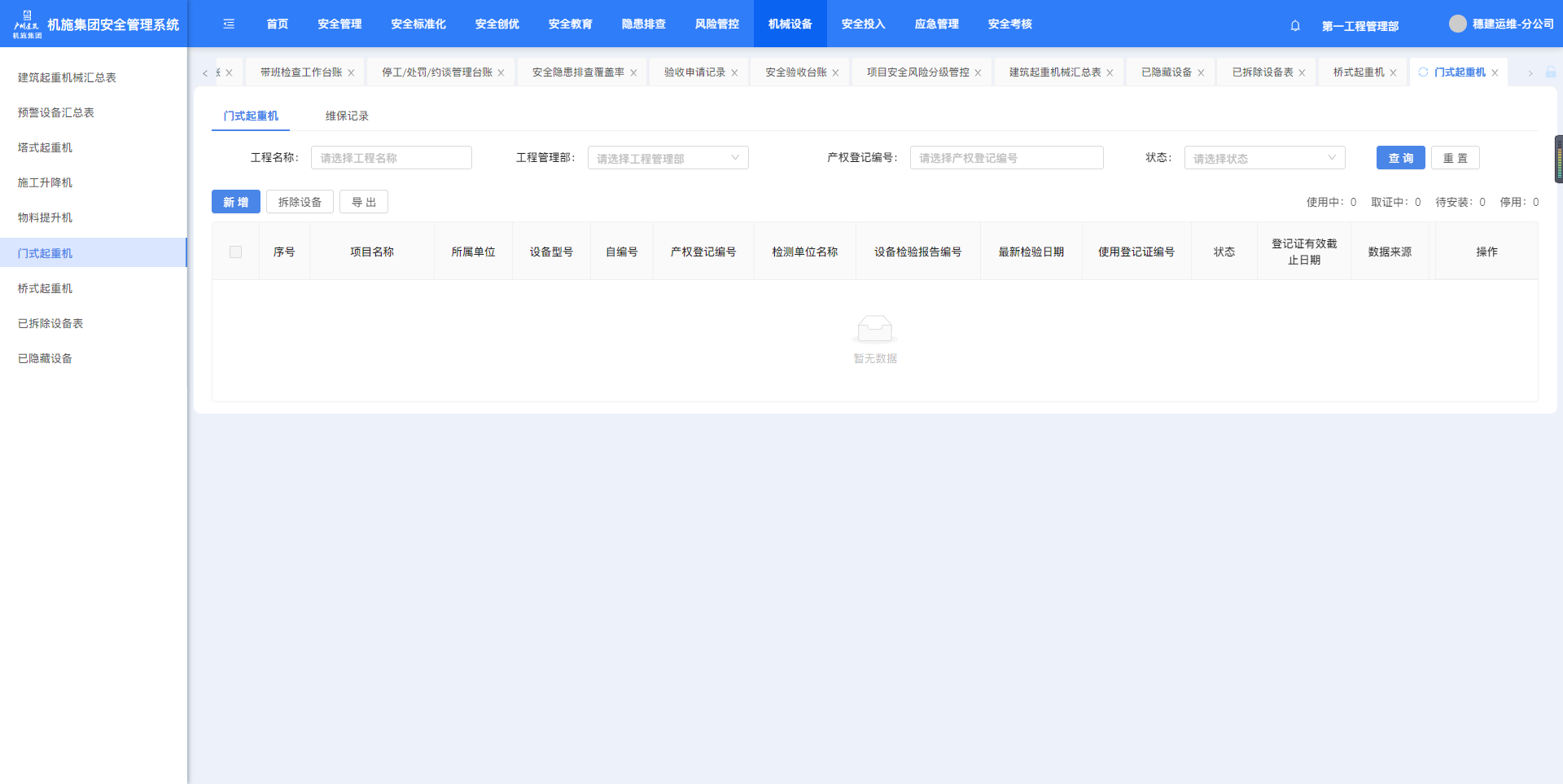 点击菜单进入门式起重机页面。可筛选工程名称、工程管理部、产权登记编号、状态,点击查询按筛选条件查询。点击【导出】可以导出汇总表内容。点击【查看】可跳转至设备详情页面。