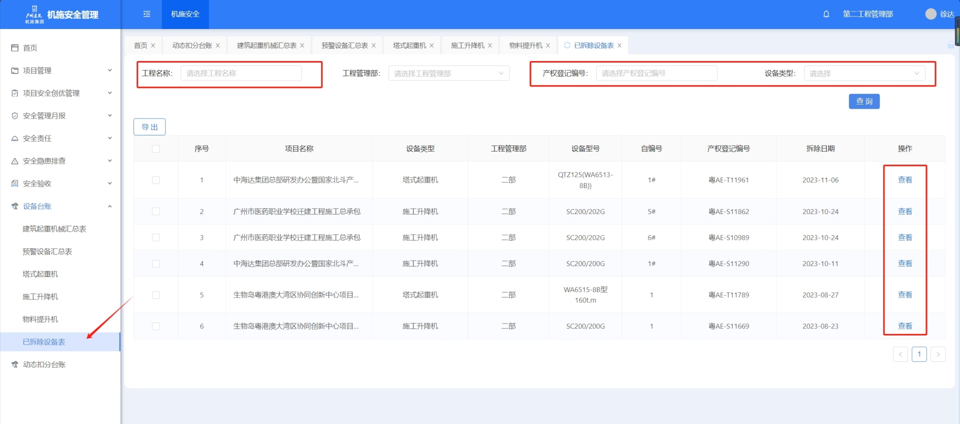 点击菜单进入已拆除列表页面。可筛选工程名称、产权登记编号、设备类型,点击查询按筛选条件查询。点击【导出】可以导出汇总表内容。点击【查看】可跳转至设备详情页面。