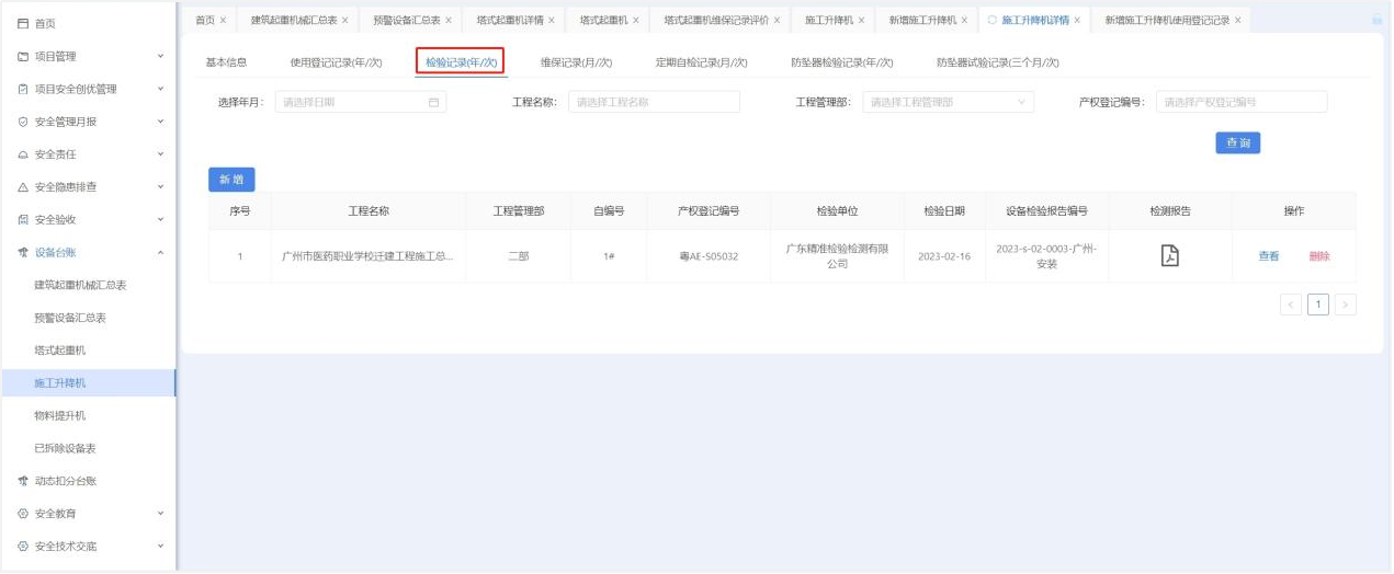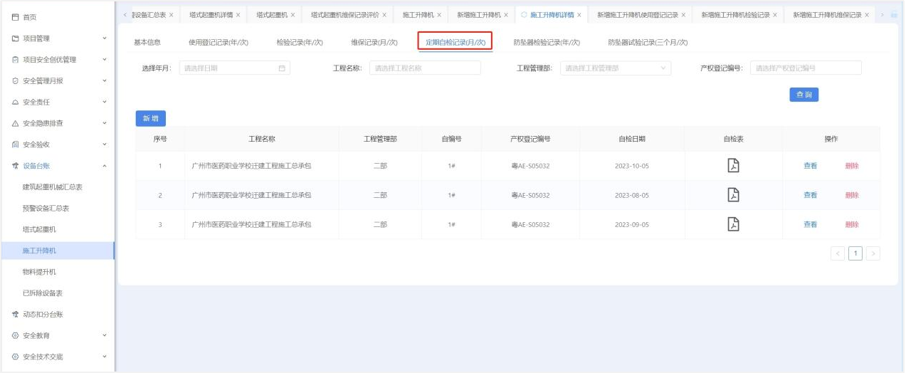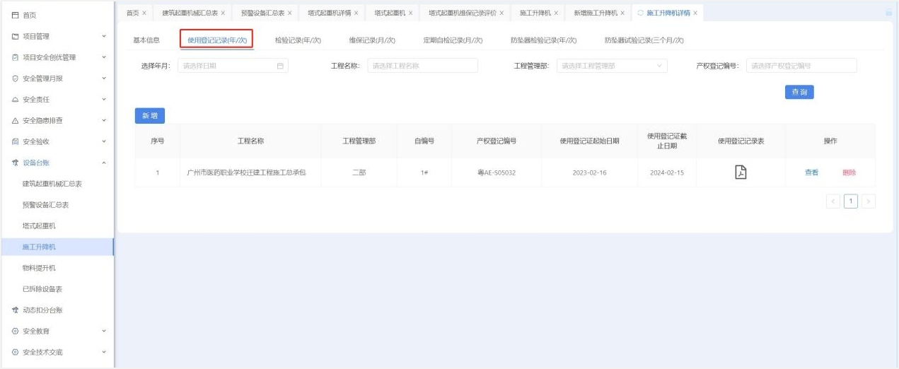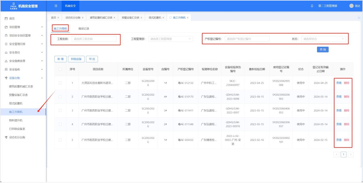 点击菜单进入施工升降机页面。可筛选工程名称、产权登记编号和状态,点击查询按筛选条件查询。点击【导出】可以导出汇总表内容。点击【查看】可跳转至设备详情页面。点击【删除】可删除。