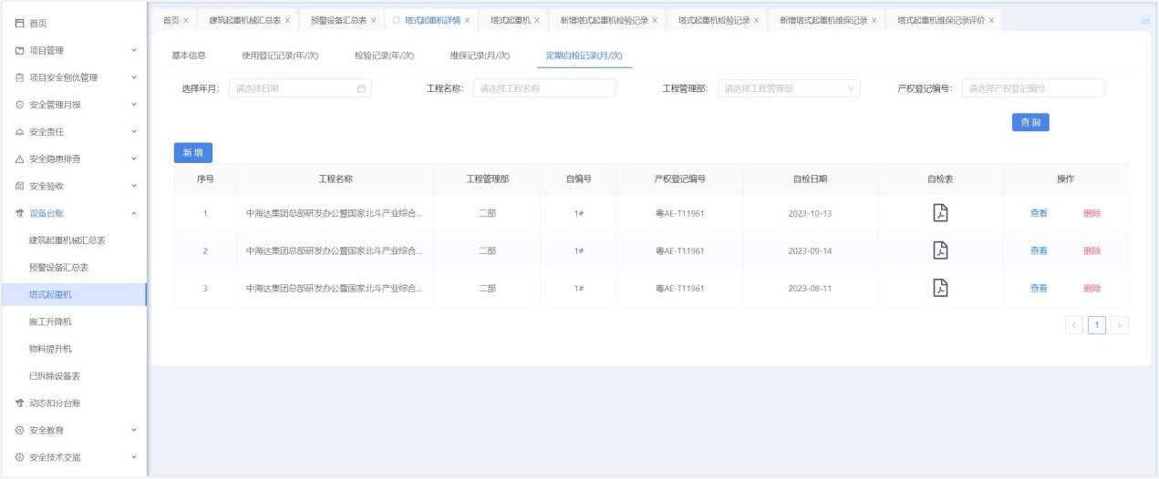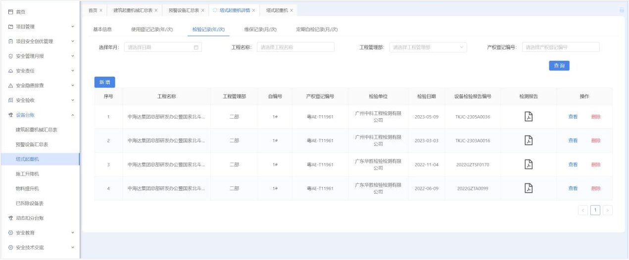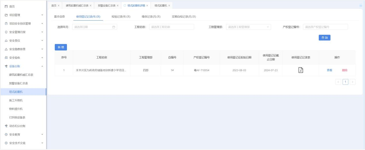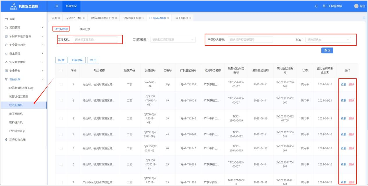 点击菜单进入塔式起重机页面。可筛选工程名称、产权登记编号和状态,点击查询按筛选条件查询。点击【导出】可以导出汇总表内容。点击【查看】可跳转至设备详情页面。点击【删除】可删除。