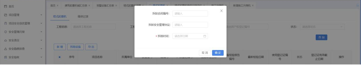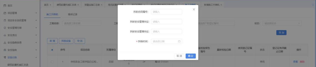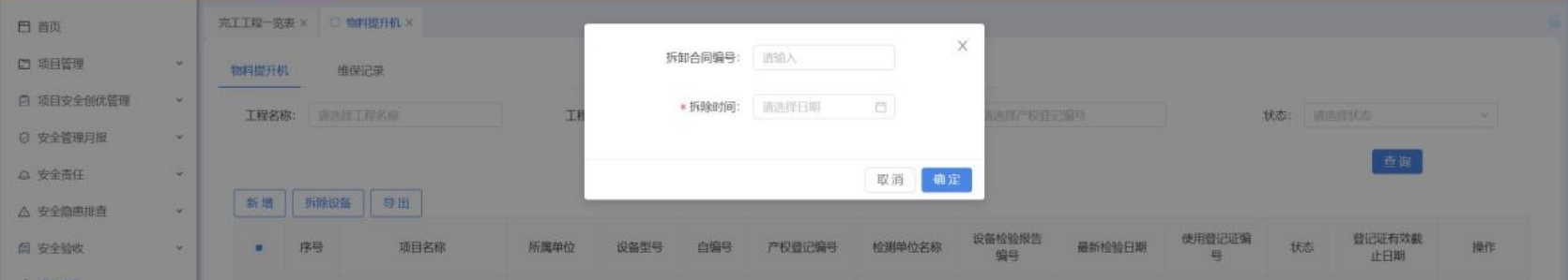 点击【拆除设备】输入内容并点击【确认】后可拆除选中的施工升降机。拆除的施工升降机在已拆除设备列表中展示。