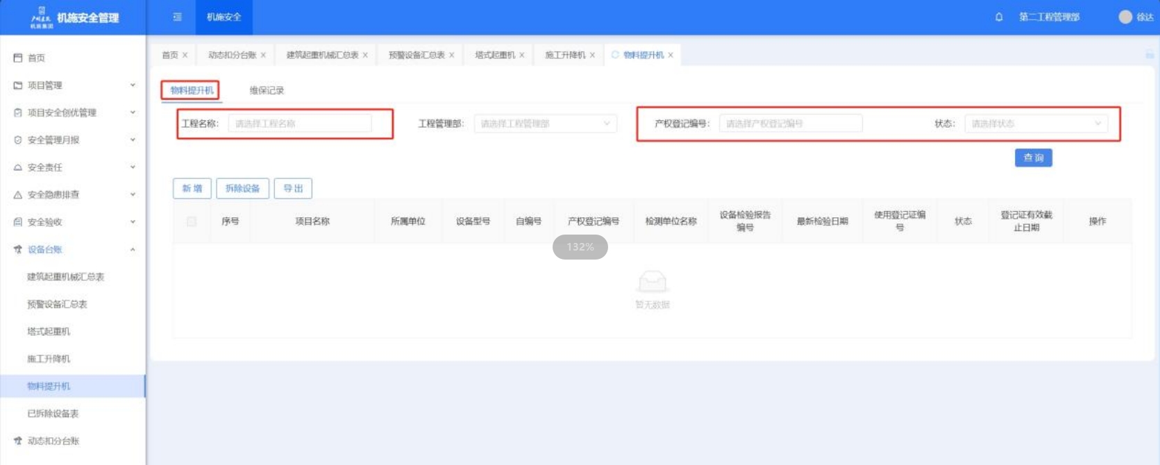 点击菜单进入物料提升机页面。可筛选工程名称、设备类型和状态,点击查询按筛选条件查询。点击【导出】可以导出汇总表内容。点击【查看】可跳转至设备详情页面。点击【删除】可删除。