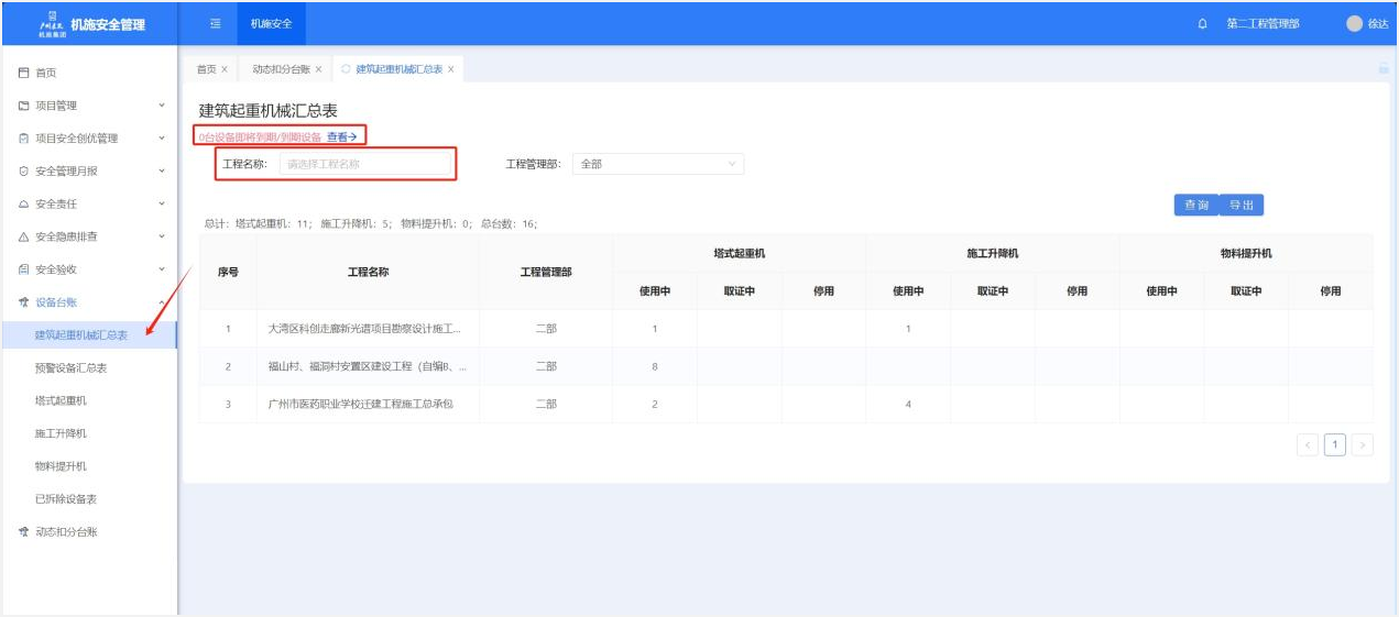 点击菜单进入建筑起重机械汇总表页面,点击即将到期/到期设备【查看】可跳转至预警设备汇总表。筛选工程名称,点击【查询】按筛选条件查询。点击【导出】可以导出汇总表内容。页面展示总计数据,包括塔式起重机台数、施工升降机台数、物料提升机台数和总台数。