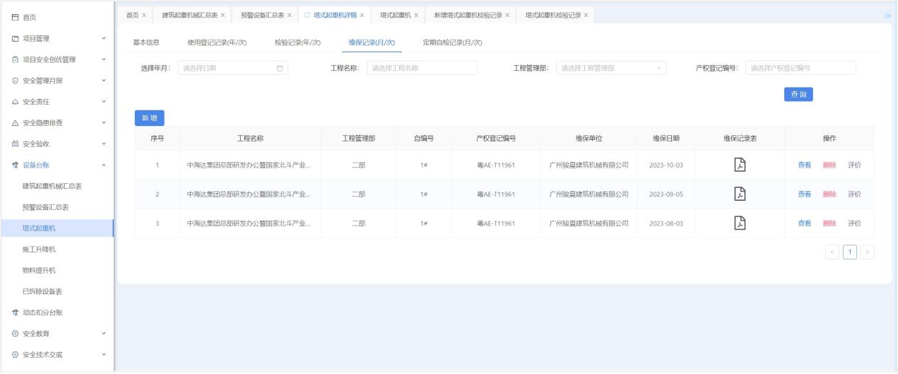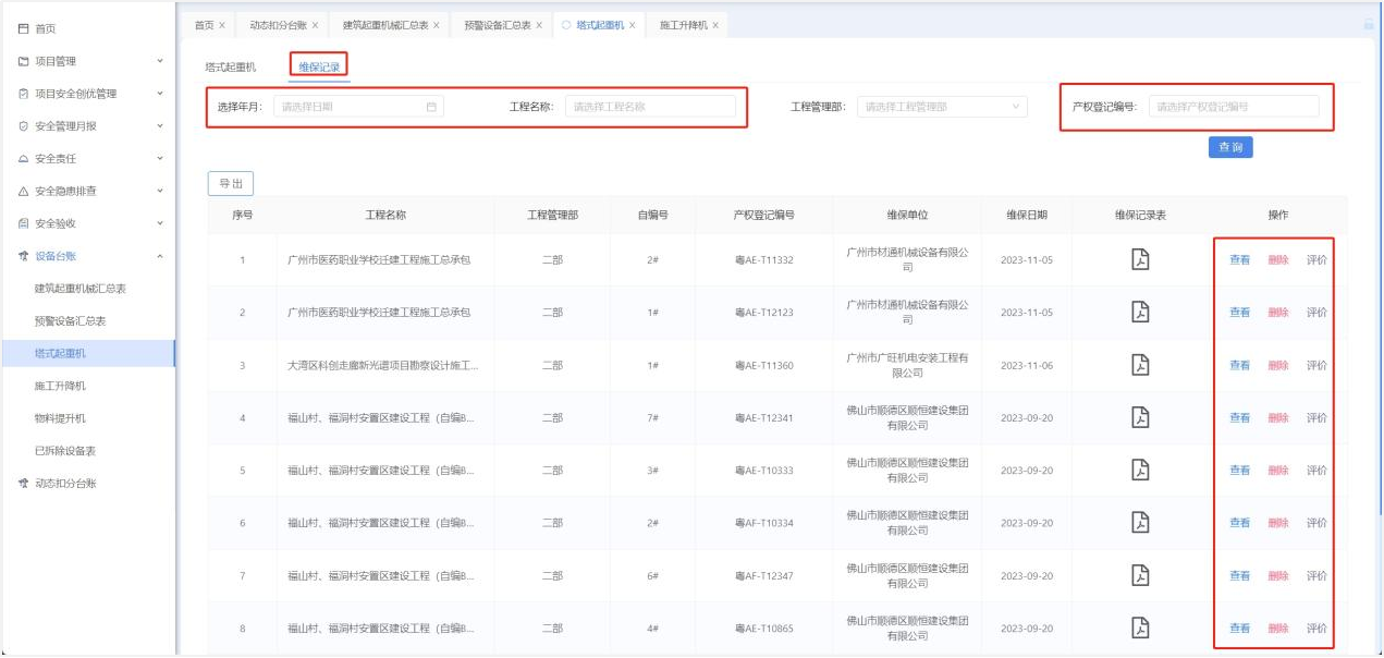 点击【维保记录】可切换到塔式起重机的维保记录,可筛选选择年月、工程名称、产权登记编号,点击【查询】按筛选条件查询。点击【导出】可以导出维保记录。点击【查看】可跳转至设备详情页面。可【删除】维保记录和【评价】维保单位。