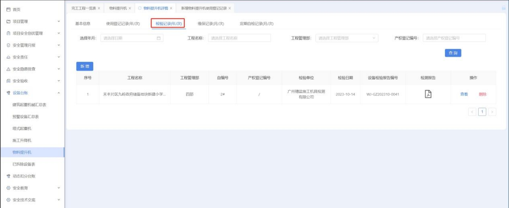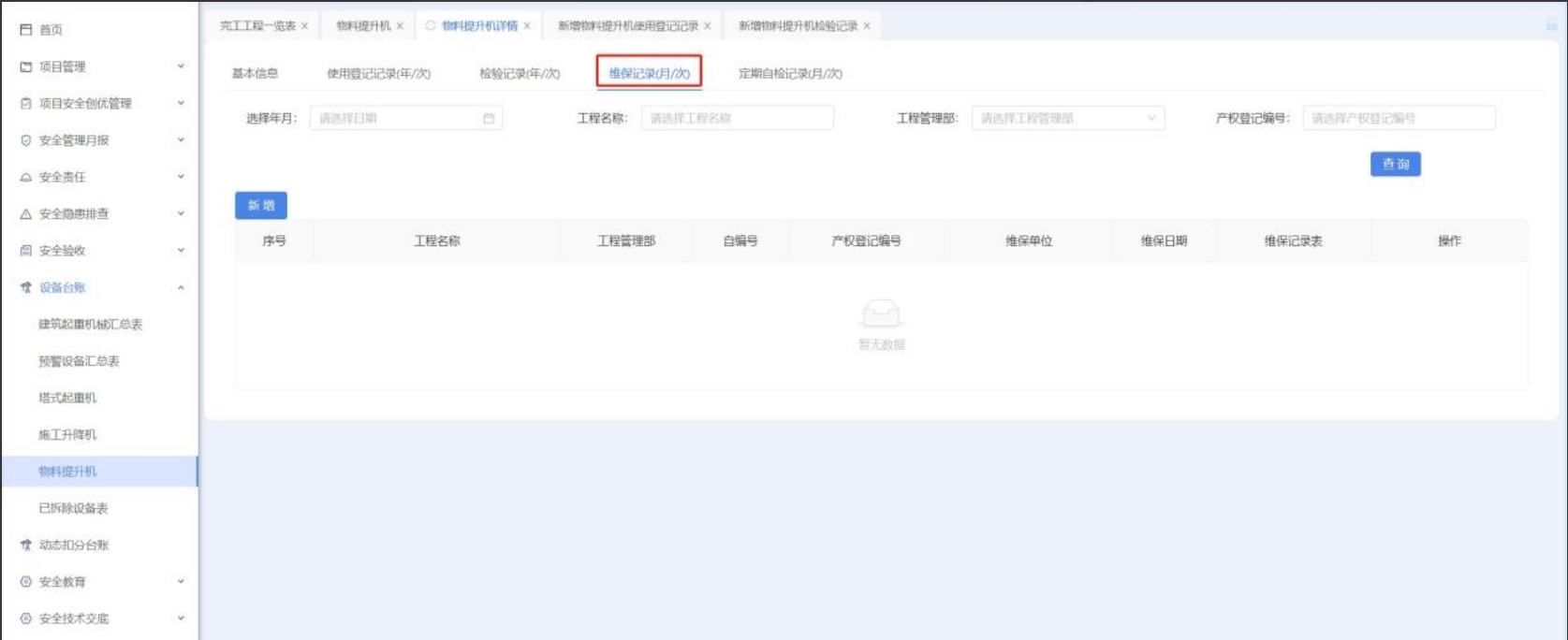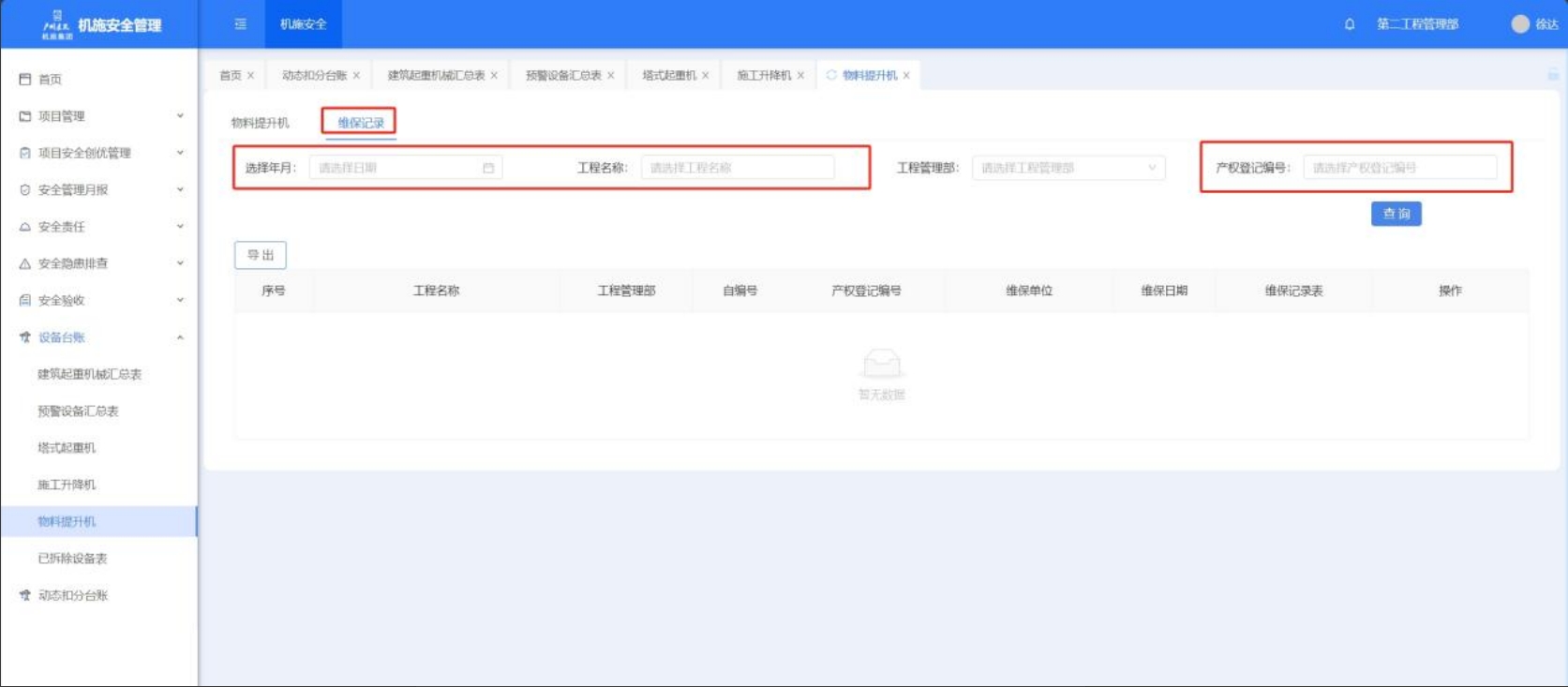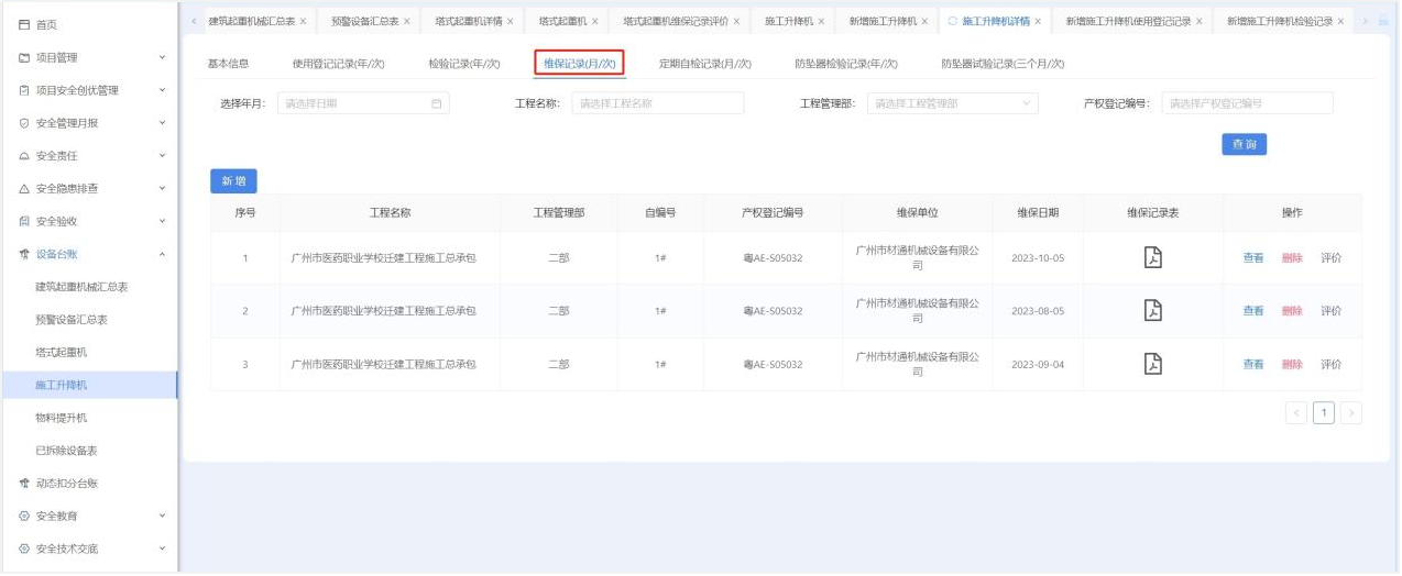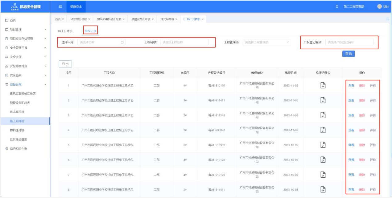 点击【维保记录】可切换到物料提升机的维保记录,可筛选选择年月、工程名称、产权登记编号,点击【查询】按筛选条件查询。点击【导出】可以导出维保记录。点击【查看】可跳转至设备详情页面。可【删除】维保记录和【评价】维保单位。
