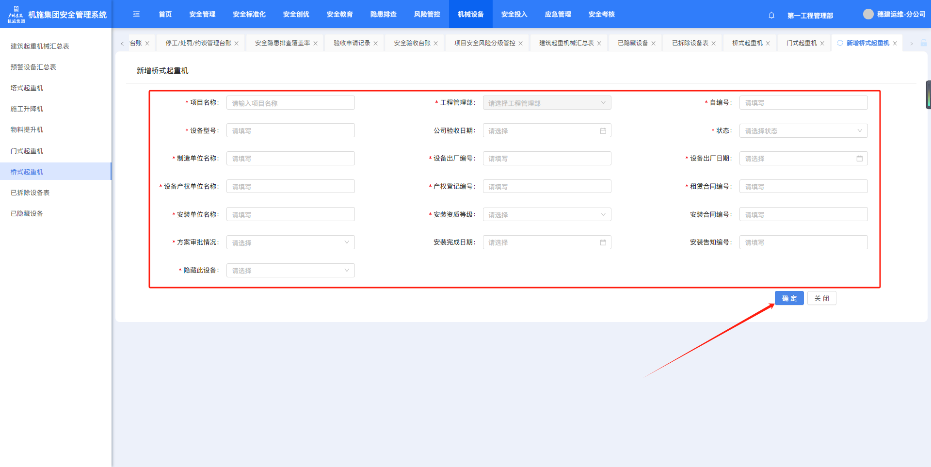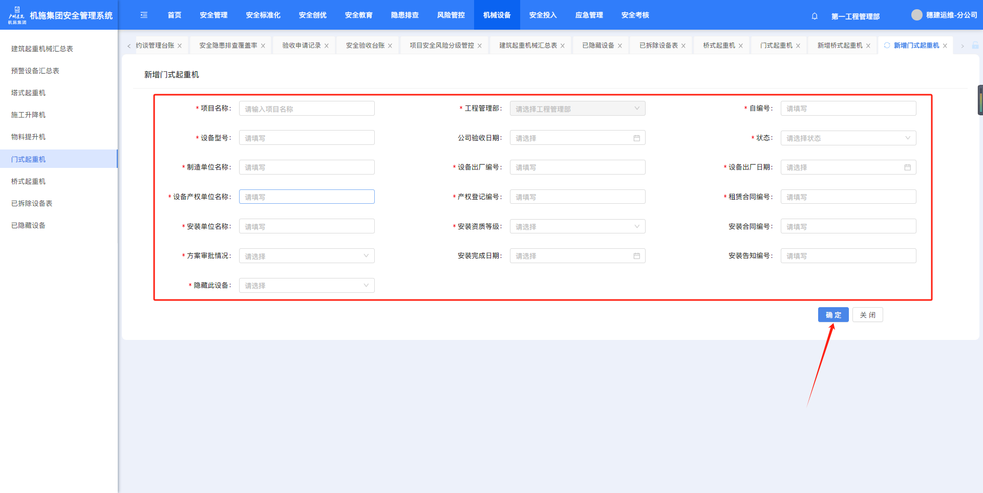 点击【新增】进入门式起重机新增页面,点击确定新增。