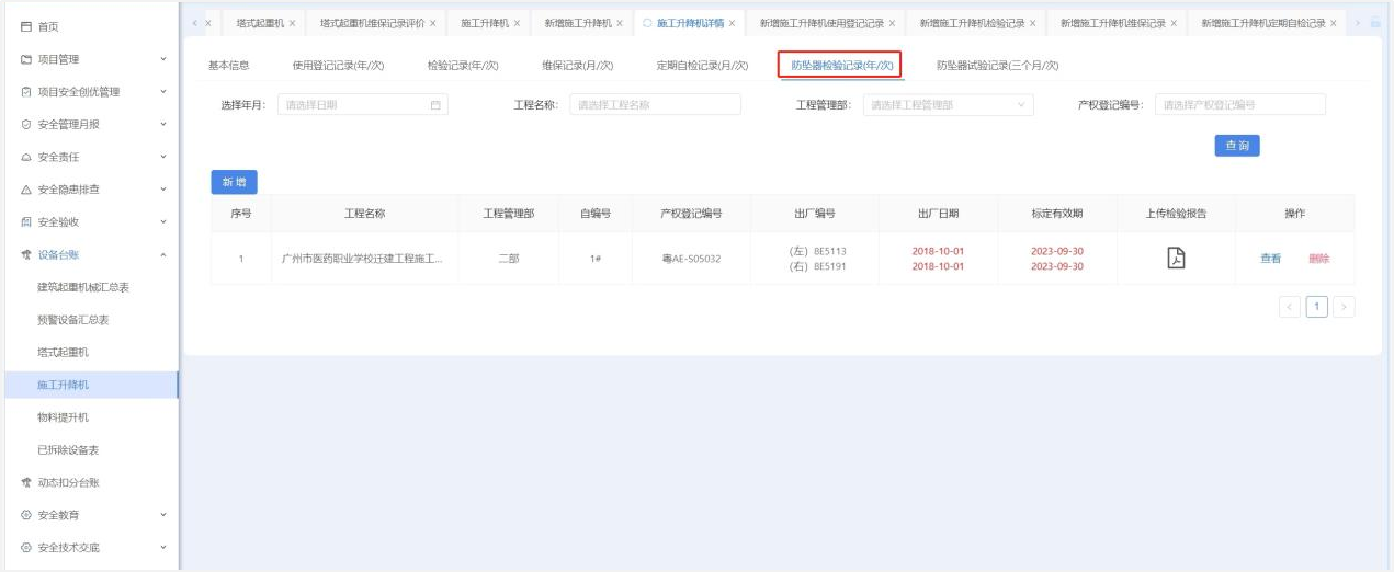 点击【新增】进入新增防坠器检验记录(年/次)。