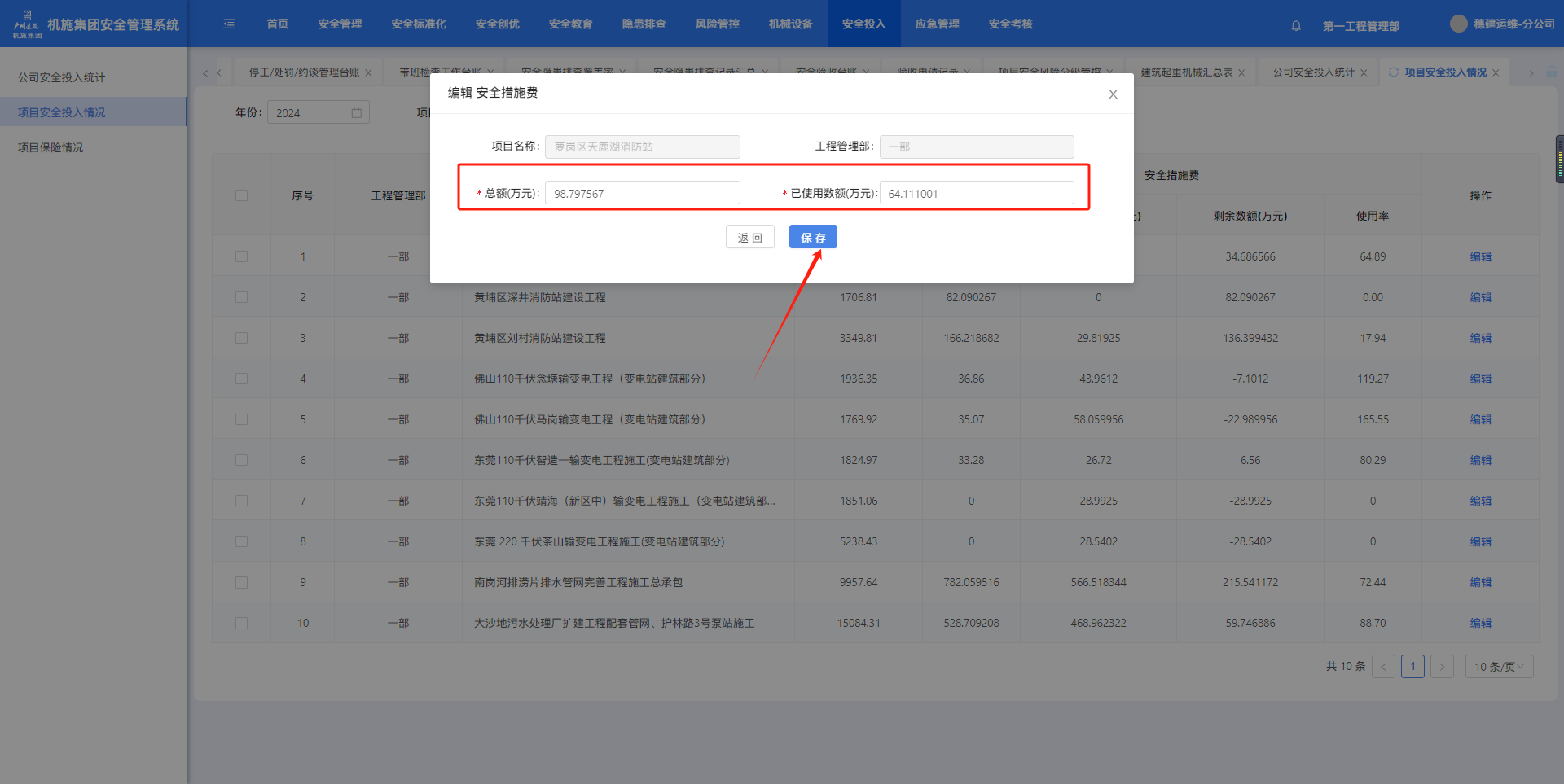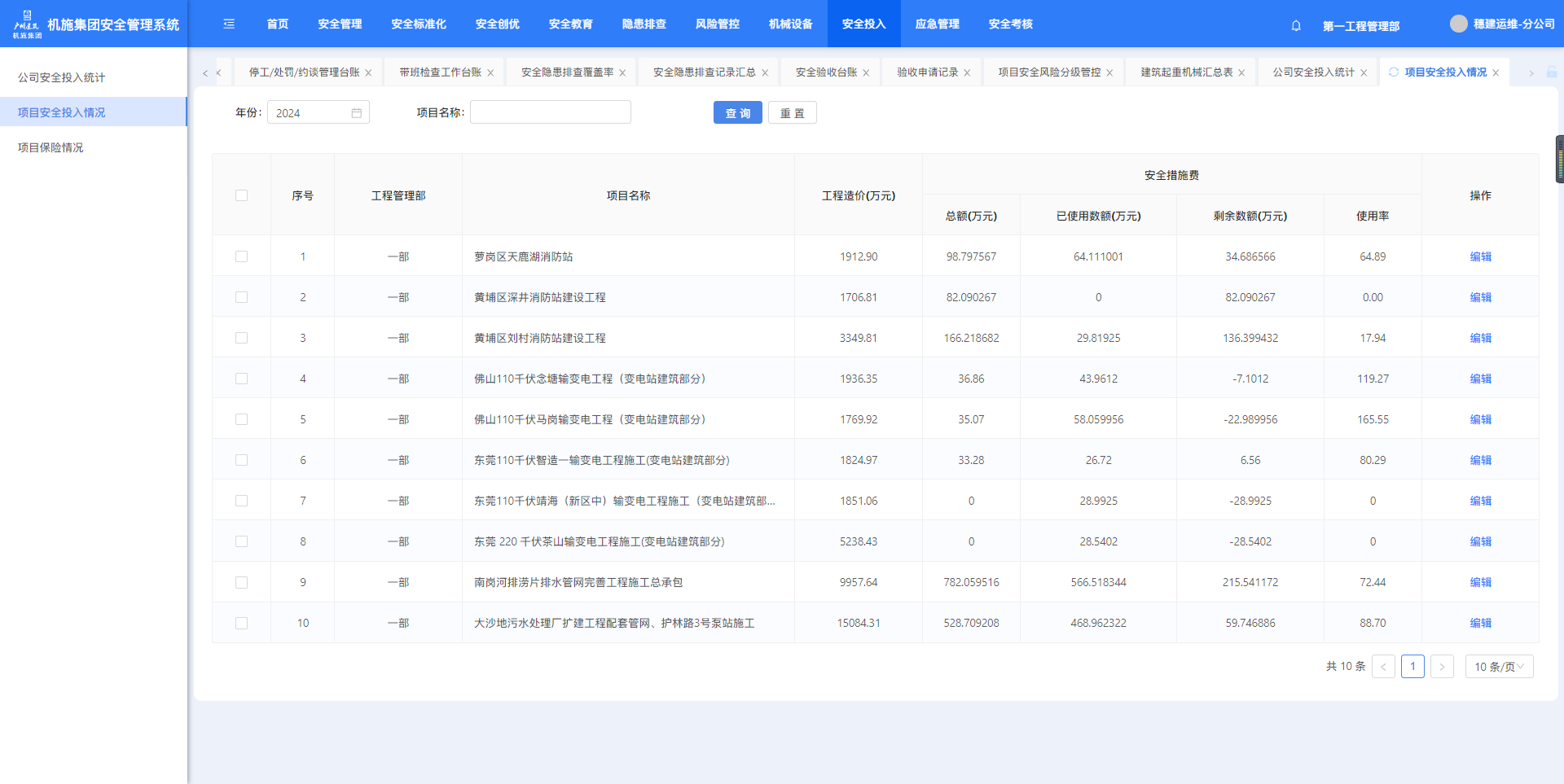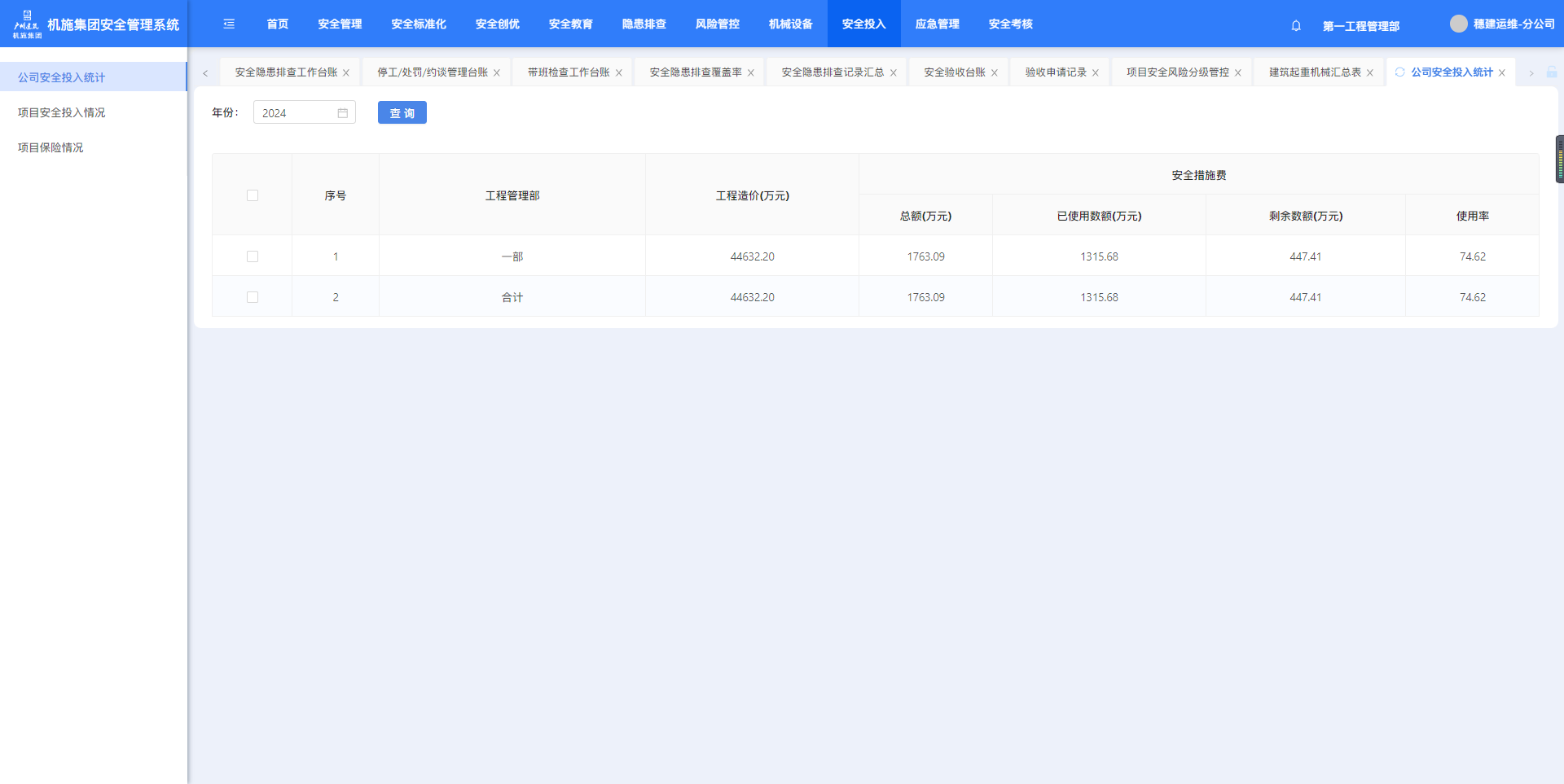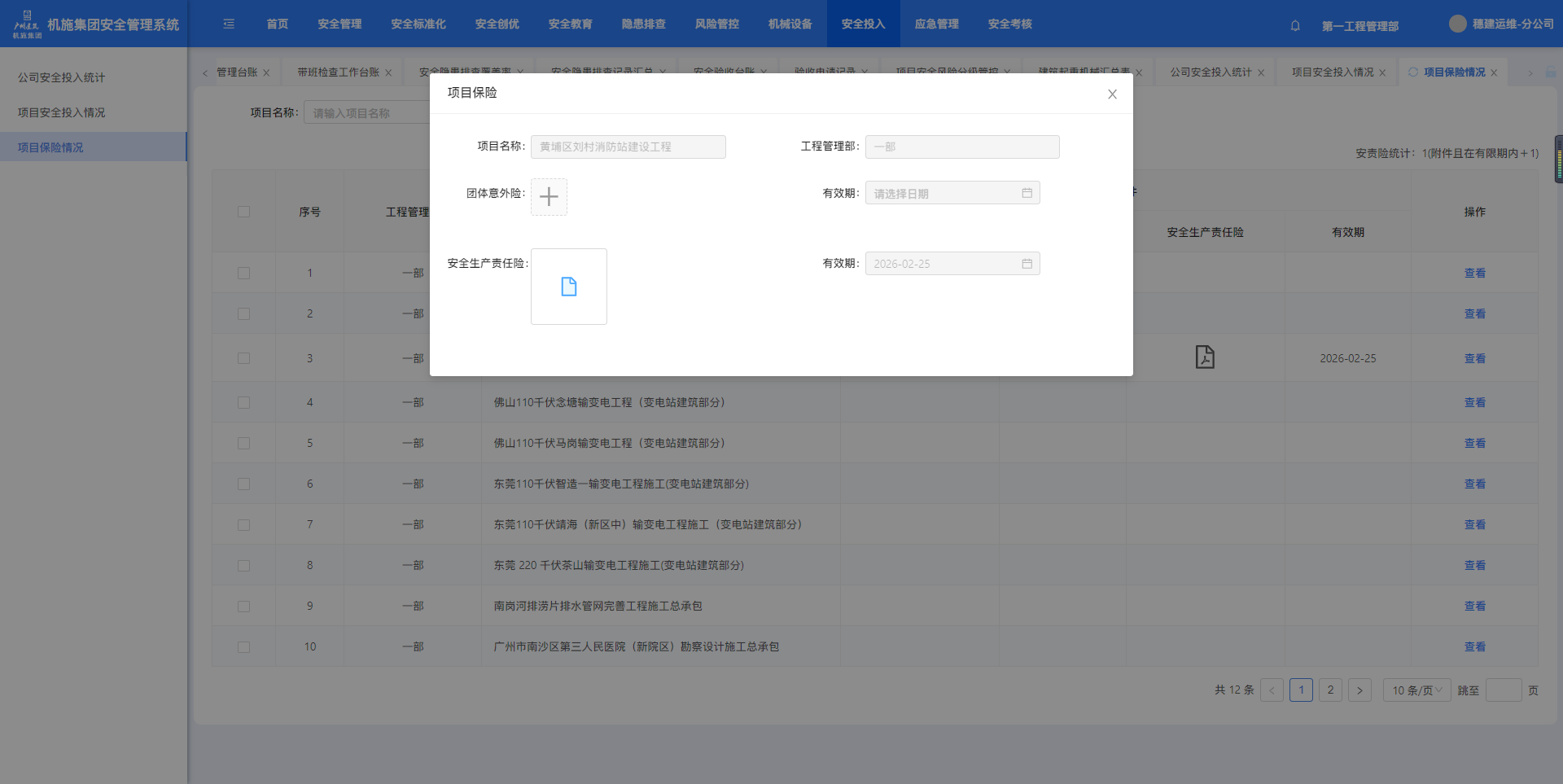 点击菜单进入项目安全投入情况页面。可以年费、项目名称查询。点击【查看】可跳转至设备详情页面。