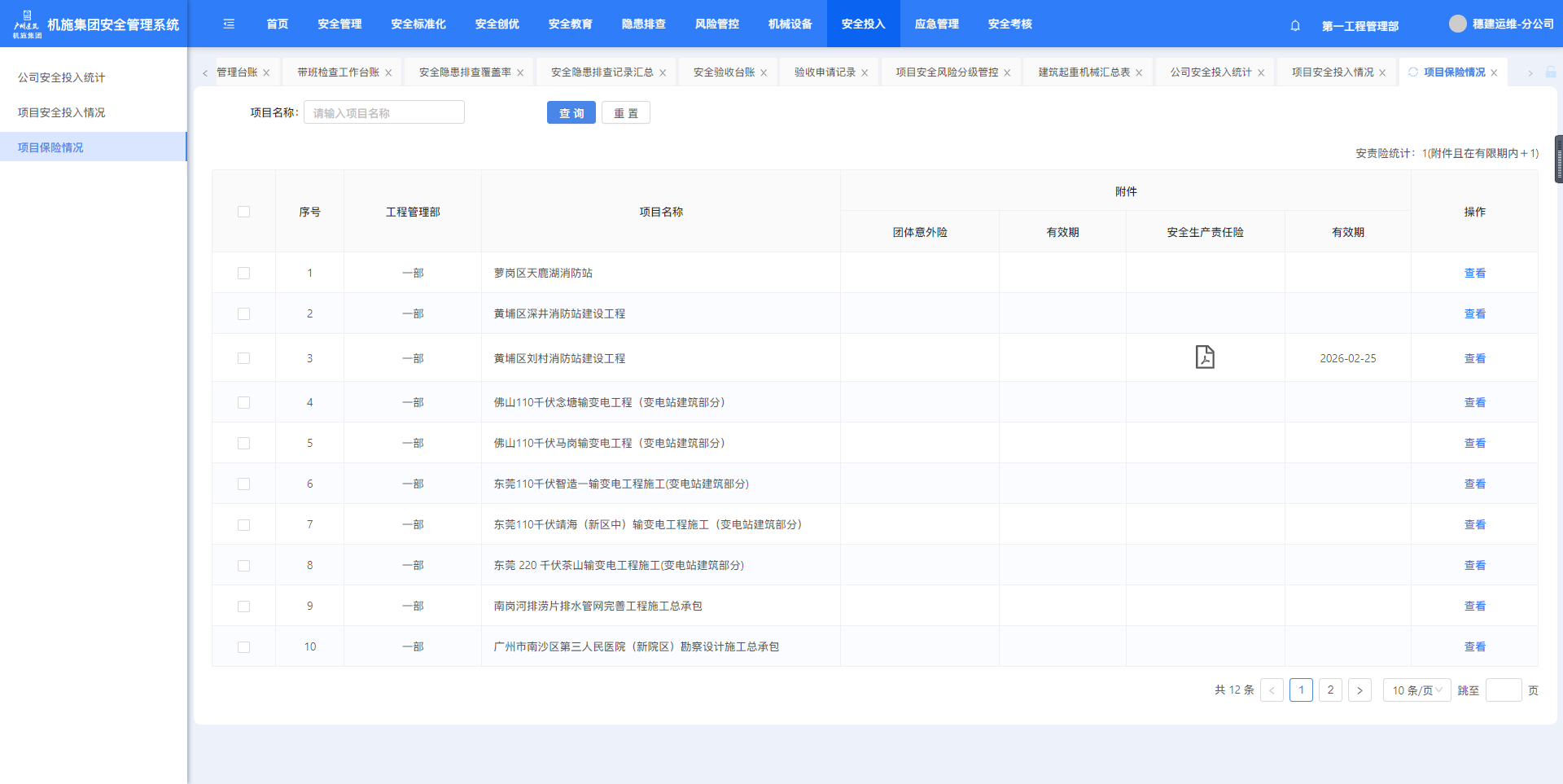 点击菜单进入项目保险情况页面。可已项目名称查询,点击【查看】可跳转至设备详情页面。