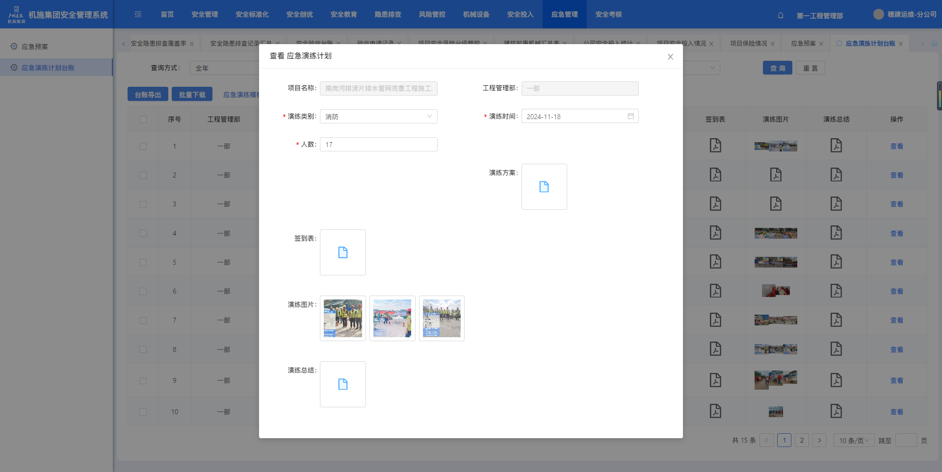 目录 搜索 展开 机施安全部功能操作说明一、安全管理1、项目管理2、安全管理月报3、安全责任4、规范及通知文件5、安全管理制度及工作指引6、企业证件及安全管理机构7、动态扣分台账二、安全标准化三、安全创优1、在建项目安全创优2、项目安全创优台账3、省双优检管理4、创优证书列表四、安全教育1、在线教育设置2、公司年度安全教育3、安全技术交底模板管理及配置五、隐患排查1、安全隐患排查2、安全验收管理六、风险管控七、机械设备八、安全投入九、应急管理十、安全考核十一、安全事故工程管理部功能操作说明一、安全管理1、项目管理2、安全管理月报3、安全责任4、规范及通知文件5、安全管理制度及工作指引6、动态扣分台账二、安全标准化三、安全创优1、在建项目安全创优2、项目安全创优台账3、省双优检管理四、安全教育五、隐患排查1、安全隐患排查2、安全验收管理六、风险管控七、机械设备八、安全投入九、应急管理十、安全考核项目部功能操作说明一、安全管理1、安全管理月报2、安全责任3、规范及通知文件4、安全管理制度及工作指引5、动态扣分台账6、施工安全日志二、安全标准化三、安全创优1、在建项目安全创优2、项目安全创优台账3、省双优检管理四、安全教育五、隐患排查1、安全隐患排查2、安全验收管理六、风险管控七、机械设备八、安全投入九、应急管理 暂无相关搜索结果! 阅读次数:46 本文档使用 MinDoc 发布 九、应急管理 9.1.应急预案点击菜单进入应急预案页面,点击【批量下载】可下载附件。 9.2.应急演练计划台账点击菜单进入应急演练计划台账页面,按条件筛选,点击【台账导出】可导出台账,点击【批量下载】可下载勾选项的附件。点击【查看】可以打开应急演练计划台账详情。作者:周子艺 创建时间:2024-11-26 14:55最后编辑:周子艺 更新时间:2025-04-22 14:01