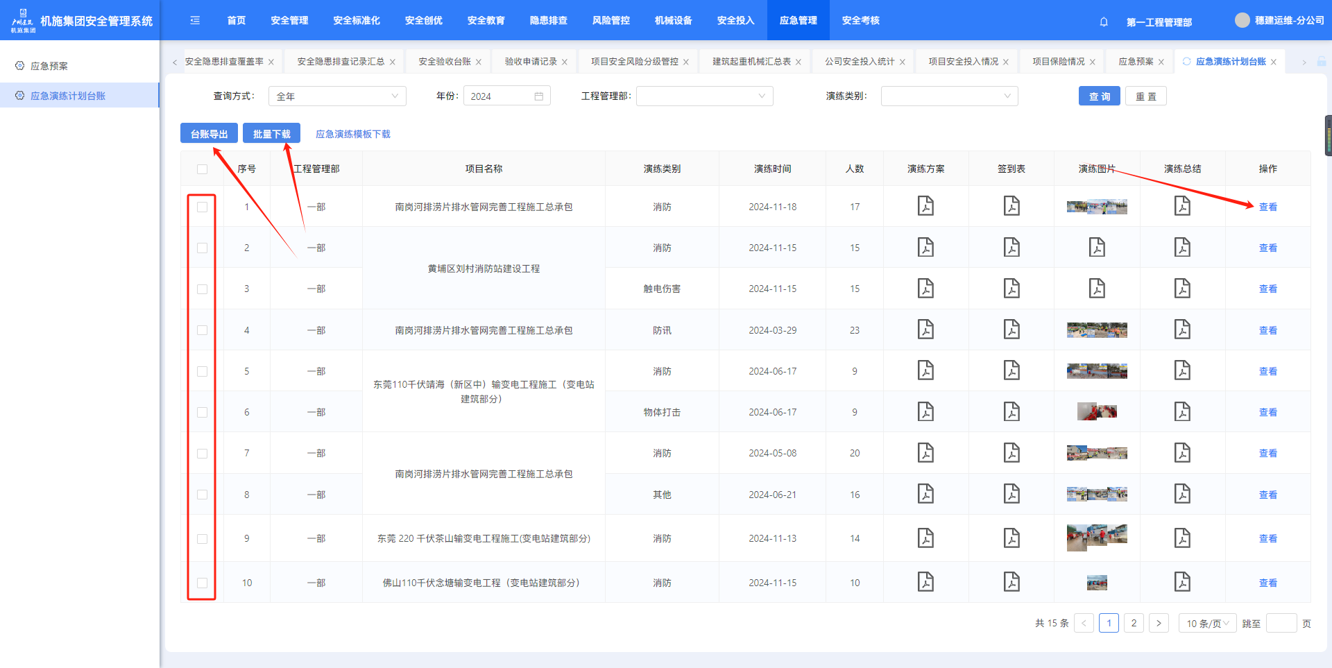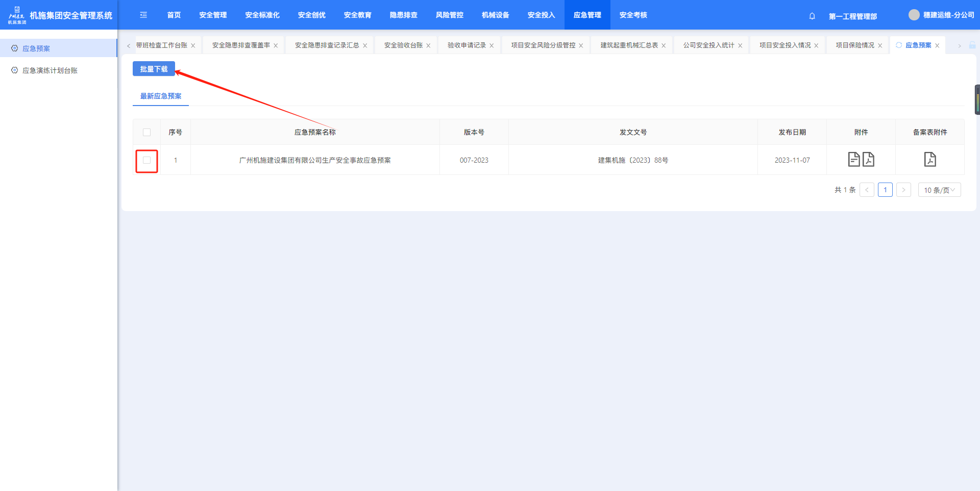 9.1.应急预案点击菜单进入应急预案页面,点击【批量下载】可下载附件。 9.2.应急演练计划台账点击菜单进入应急演练计划台账页面,按条件筛选,点击【台账导出】可导出台账,点击【批量下载】可下载勾选项的附件。点击【查看】可以打开应急演练计划台账详情。作者:周子艺 创建时间:2024-11-26 14:55最后编辑:周子艺 更新时间:2025-04-22 14:01