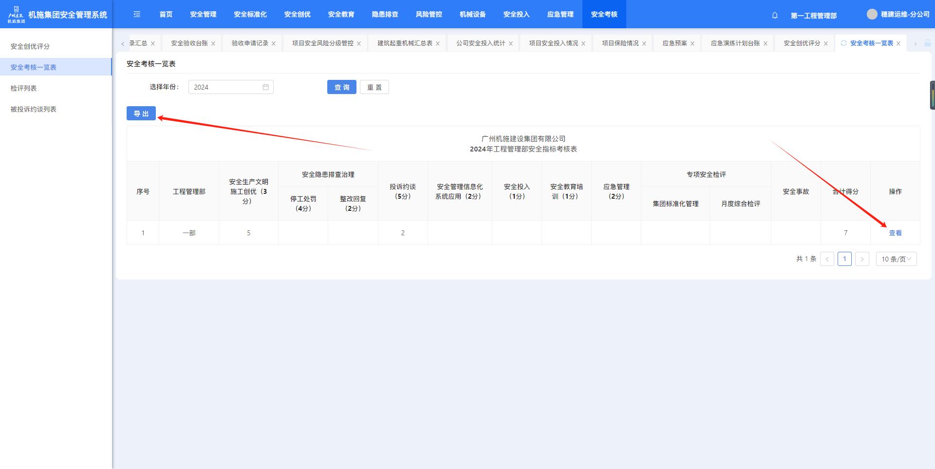 10.1.安全创优评分点击菜单进入安全创优评分页面,按条件筛选查询。 10.2.安全考核一览表点击菜单进入安全考核一览表页面,按条件筛选,点击【导出】可导出台账。点击【查看】可以查看详情。 10.3.检评列表点击菜单进入检评列表页面,按条件筛选查询。 10.4.被投诉约谈列表点击菜单进入被投诉约谈列表页面,按条件筛选查询。作者:周子艺 创建时间:2024-11-26 14:57最后编辑:周子艺 更新时间:2025-04-22 14:01