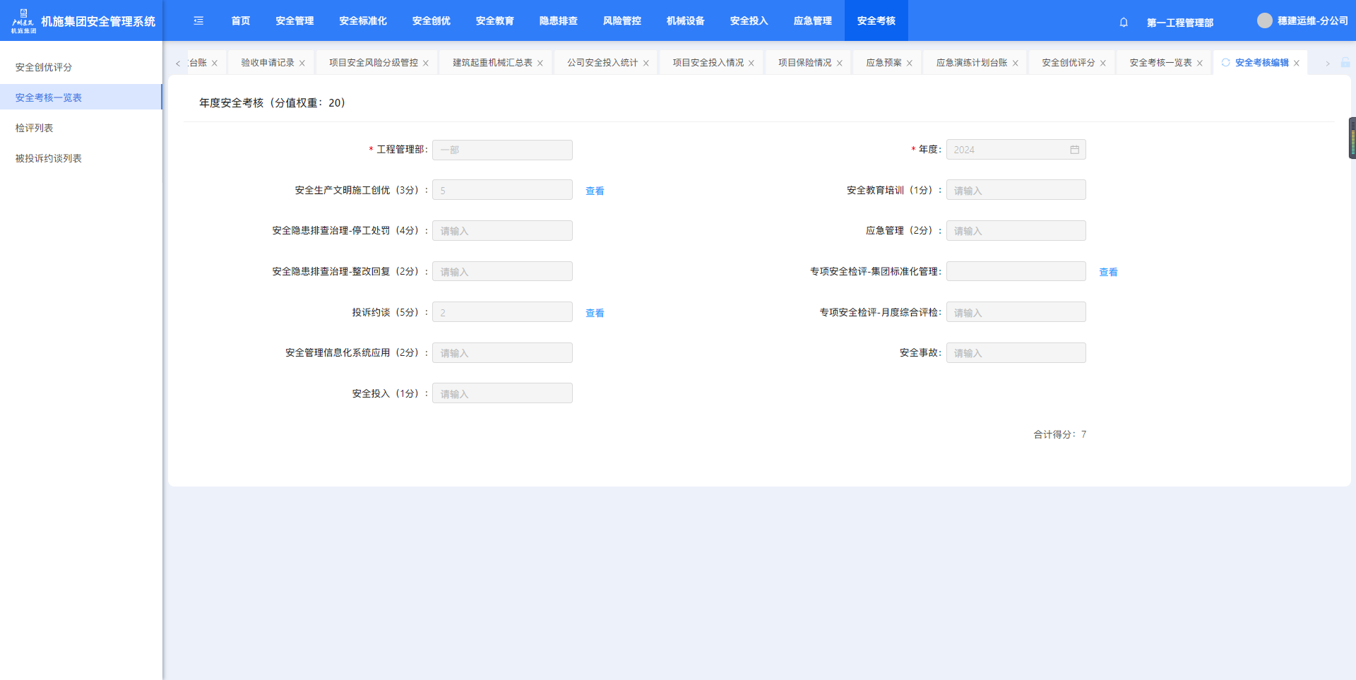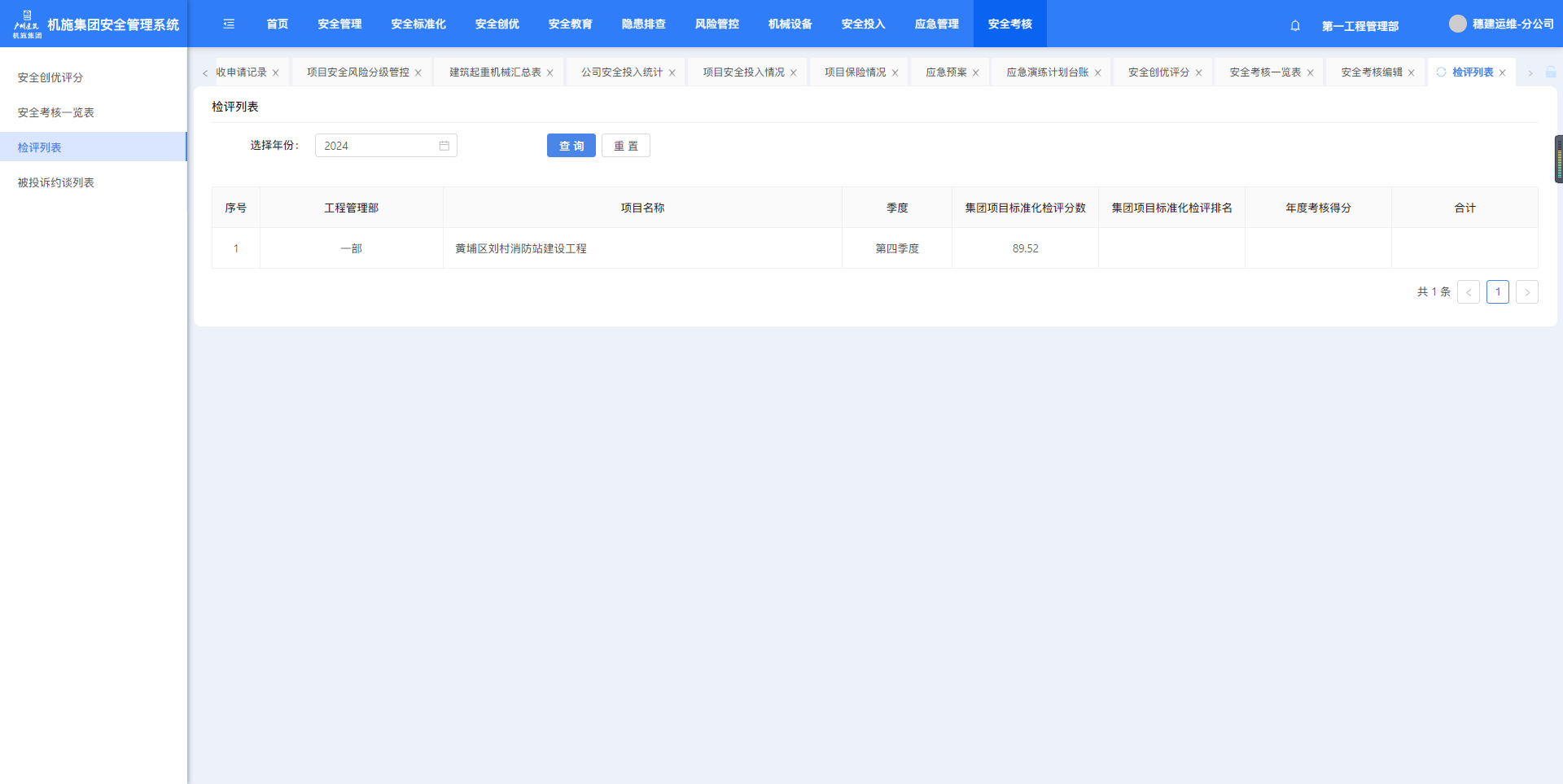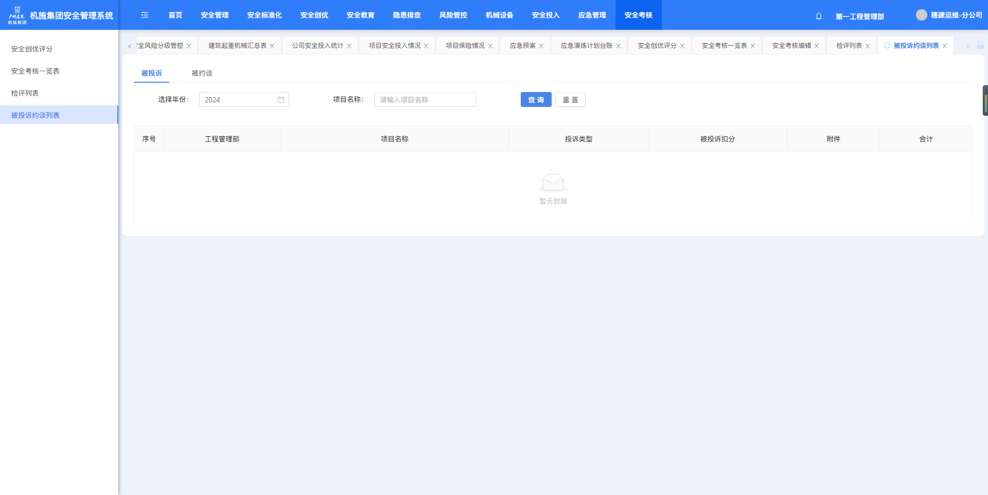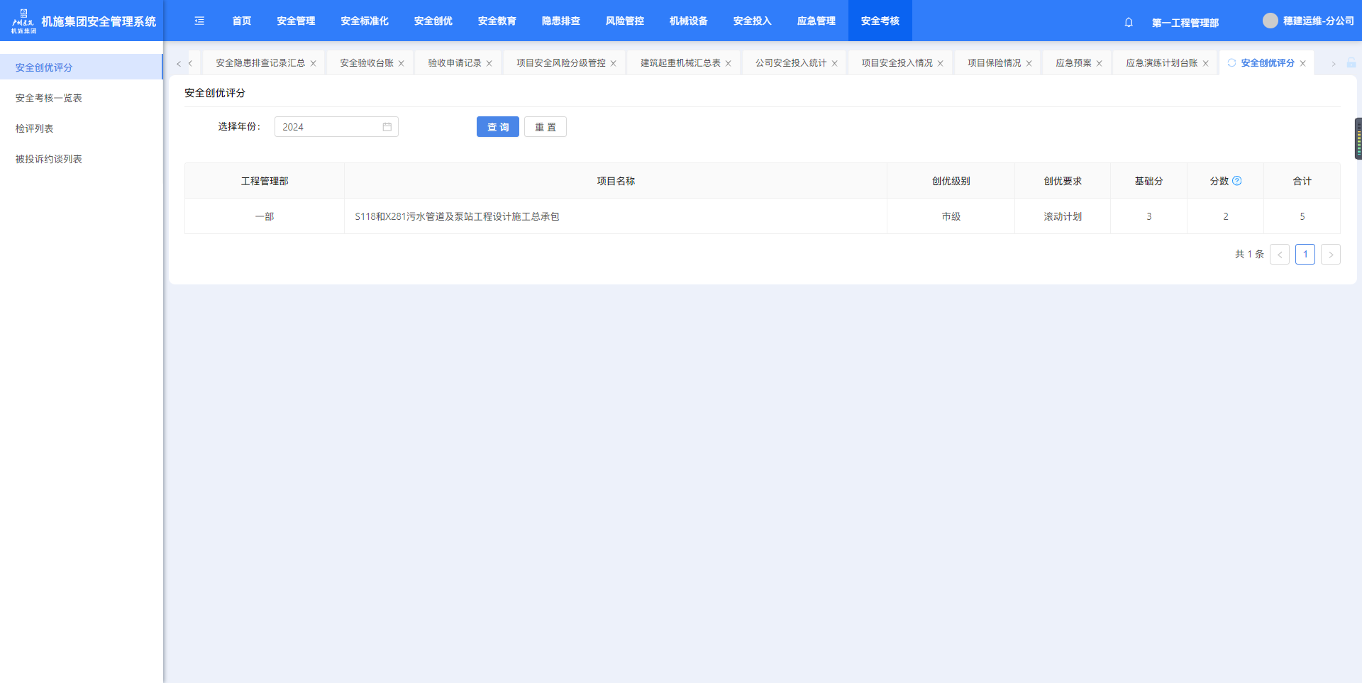 目录 搜索 展开 机施安全部功能操作说明一、安全管理1、项目管理2、安全管理月报3、安全责任4、规范及通知文件5、安全管理制度及工作指引6、企业证件及安全管理机构7、动态扣分台账二、安全标准化三、安全创优1、在建项目安全创优2、项目安全创优台账3、省双优检管理4、创优证书列表四、安全教育1、在线教育设置2、公司年度安全教育3、安全技术交底模板管理及配置五、隐患排查1、安全隐患排查2、安全验收管理六、风险管控七、机械设备八、安全投入九、应急管理十、安全考核十一、安全事故工程管理部功能操作说明一、安全管理1、项目管理2、安全管理月报3、安全责任4、规范及通知文件5、安全管理制度及工作指引6、动态扣分台账二、安全标准化三、安全创优1、在建项目安全创优2、项目安全创优台账3、省双优检管理四、安全教育五、隐患排查1、安全隐患排查2、安全验收管理六、风险管控七、机械设备八、安全投入九、应急管理十、安全考核项目部功能操作说明一、安全管理1、安全管理月报2、安全责任3、规范及通知文件4、安全管理制度及工作指引5、动态扣分台账6、施工安全日志二、安全标准化三、安全创优1、在建项目安全创优2、项目安全创优台账3、省双优检管理四、安全教育五、隐患排查1、安全隐患排查2、安全验收管理六、风险管控七、机械设备八、安全投入九、应急管理 暂无相关搜索结果! 阅读次数:34 本文档使用 MinDoc 发布 十、安全考核 10.1.安全创优评分点击菜单进入安全创优评分页面,按条件筛选查询。 10.2.安全考核一览表点击菜单进入安全考核一览表页面,按条件筛选,点击【导出】可导出台账。点击【查看】可以查看详情。 10.3.检评列表点击菜单进入检评列表页面,按条件筛选查询。 10.4.被投诉约谈列表点击菜单进入被投诉约谈列表页面,按条件筛选查询。作者:周子艺 创建时间:2024-11-26 14:57最后编辑:周子艺 更新时间:2025-04-22 14:01
