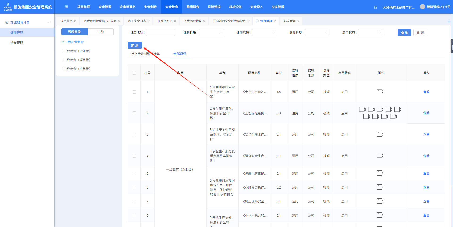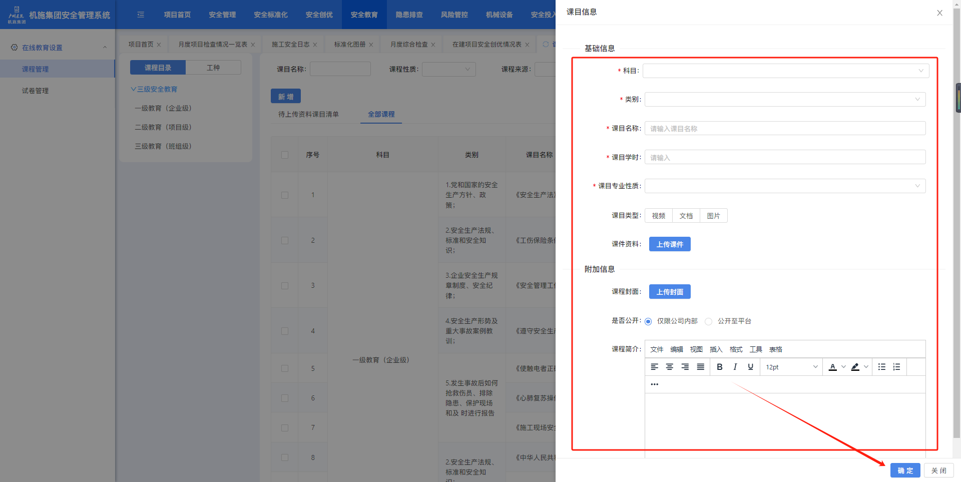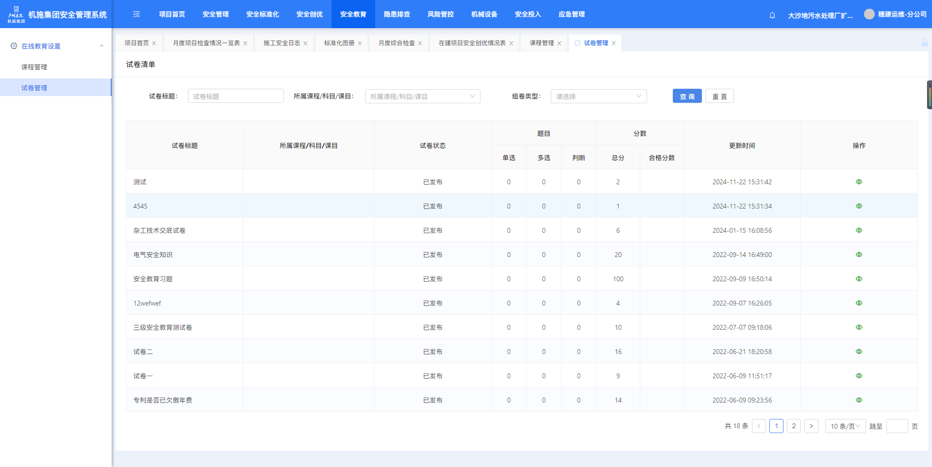 目录 搜索 展开 机施安全部功能操作说明一、安全管理1、项目管理2、安全管理月报3、安全责任4、规范及通知文件5、安全管理制度及工作指引6、企业证件及安全管理机构7、动态扣分台账二、安全标准化三、安全创优1、在建项目安全创优2、项目安全创优台账3、省双优检管理4、创优证书列表四、安全教育1、在线教育设置2、公司年度安全教育3、安全技术交底模板管理及配置五、隐患排查1、安全隐患排查2、安全验收管理六、风险管控七、机械设备八、安全投入九、应急管理十、安全考核十一、安全事故工程管理部功能操作说明一、安全管理1、项目管理2、安全管理月报3、安全责任4、规范及通知文件5、安全管理制度及工作指引6、动态扣分台账二、安全标准化三、安全创优1、在建项目安全创优2、项目安全创优台账3、省双优检管理四、安全教育五、隐患排查1、安全隐患排查2、安全验收管理六、风险管控七、机械设备八、安全投入九、应急管理十、安全考核项目部功能操作说明一、安全管理1、安全管理月报2、安全责任3、规范及通知文件4、安全管理制度及工作指引5、动态扣分台账6、施工安全日志二、安全标准化三、安全创优1、在建项目安全创优2、项目安全创优台账3、省双优检管理四、安全教育五、隐患排查1、安全隐患排查2、安全验收管理六、风险管控七、机械设备八、安全投入九、应急管理 暂无相关搜索结果! 阅读次数:47 本文档使用 MinDoc 发布 四、安全教育 4.1.课程管理点击菜单进入课程管理页面,点击【新增】可创建课程。填写课目信息上传课件。点击【确定】完成创建。 4.1.试卷管理点击菜单进入试卷管理页面,可点击眼睛图标预览试卷内容作者:周子艺 创建时间:2024-11-27 15:33最后编辑:周子艺 更新时间:2025-04-22 14:01