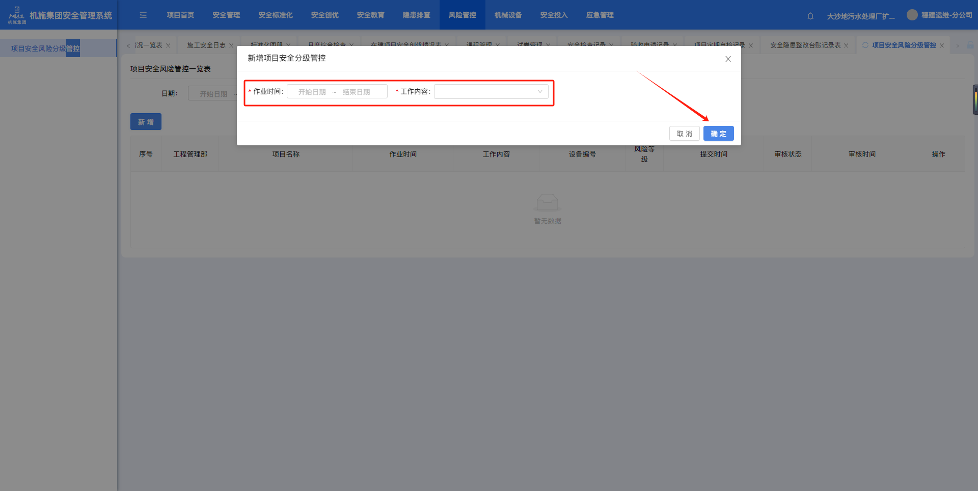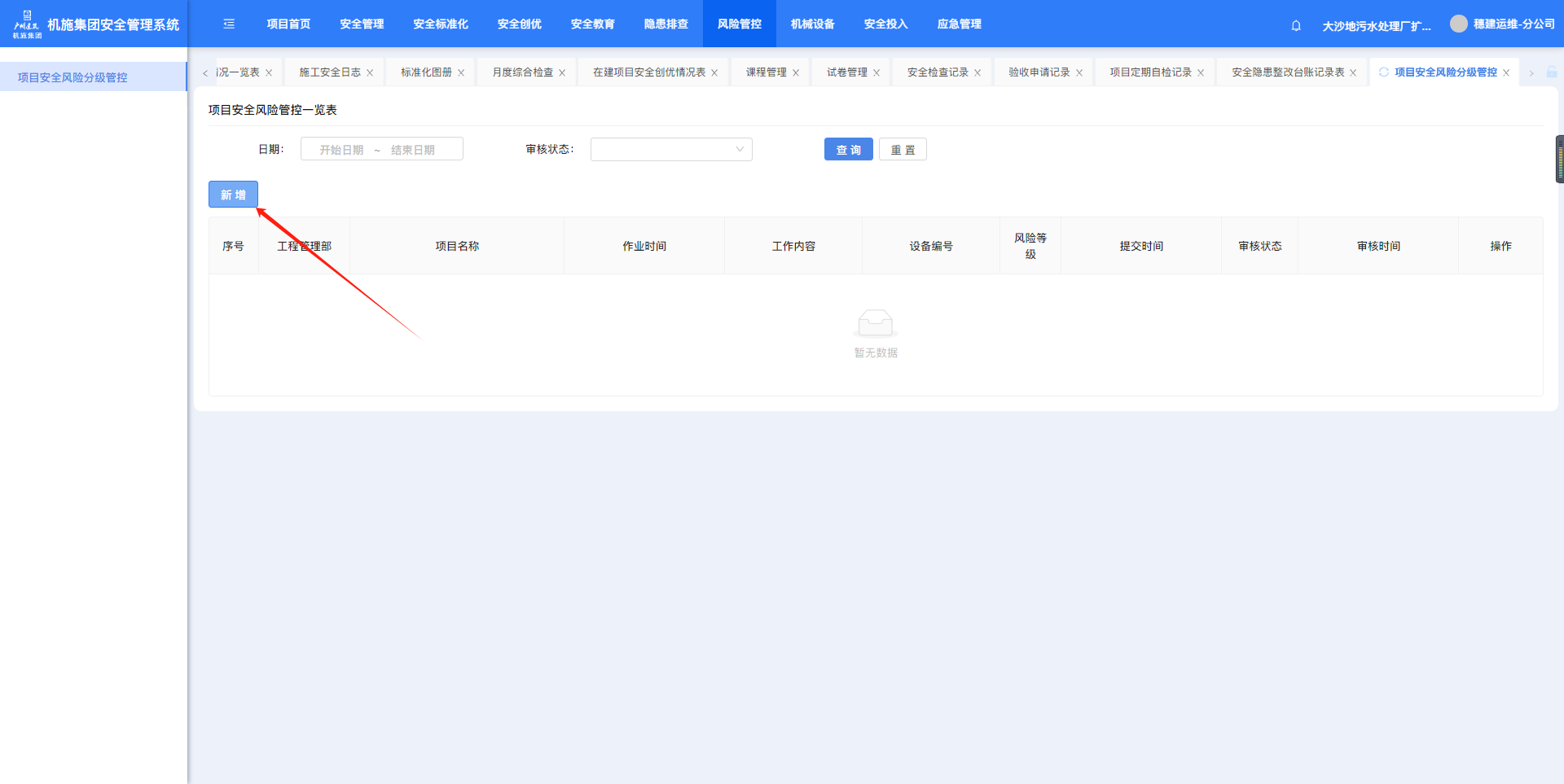 目录 搜索 展开 机施安全部功能操作说明一、安全管理1、项目管理2、安全管理月报3、安全责任4、规范及通知文件5、安全管理制度及工作指引6、企业证件及安全管理机构7、动态扣分台账二、安全标准化三、安全创优1、在建项目安全创优2、项目安全创优台账3、省双优检管理4、创优证书列表四、安全教育1、在线教育设置2、公司年度安全教育3、安全技术交底模板管理及配置五、隐患排查1、安全隐患排查2、安全验收管理六、风险管控七、机械设备八、安全投入九、应急管理十、安全考核十一、安全事故工程管理部功能操作说明一、安全管理1、项目管理2、安全管理月报3、安全责任4、规范及通知文件5、安全管理制度及工作指引6、动态扣分台账二、安全标准化三、安全创优1、在建项目安全创优2、项目安全创优台账3、省双优检管理四、安全教育五、隐患排查1、安全隐患排查2、安全验收管理六、风险管控七、机械设备八、安全投入九、应急管理十、安全考核项目部功能操作说明一、安全管理1、安全管理月报2、安全责任3、规范及通知文件4、安全管理制度及工作指引5、动态扣分台账6、施工安全日志二、安全标准化三、安全创优1、在建项目安全创优2、项目安全创优台账3、省双优检管理四、安全教育五、隐患排查1、安全隐患排查2、安全验收管理六、风险管控七、机械设备八、安全投入九、应急管理 暂无相关搜索结果! 阅读次数:57 本文档使用 MinDoc 发布 六、风险管控 筛选日期,点击【新增】创建。填写分级管控信息,点击【确定】完成新增项目安全分级管控作者:周子艺 创建时间:2024-11-27 15:34最后编辑:周子艺 更新时间:2025-04-22 14:01