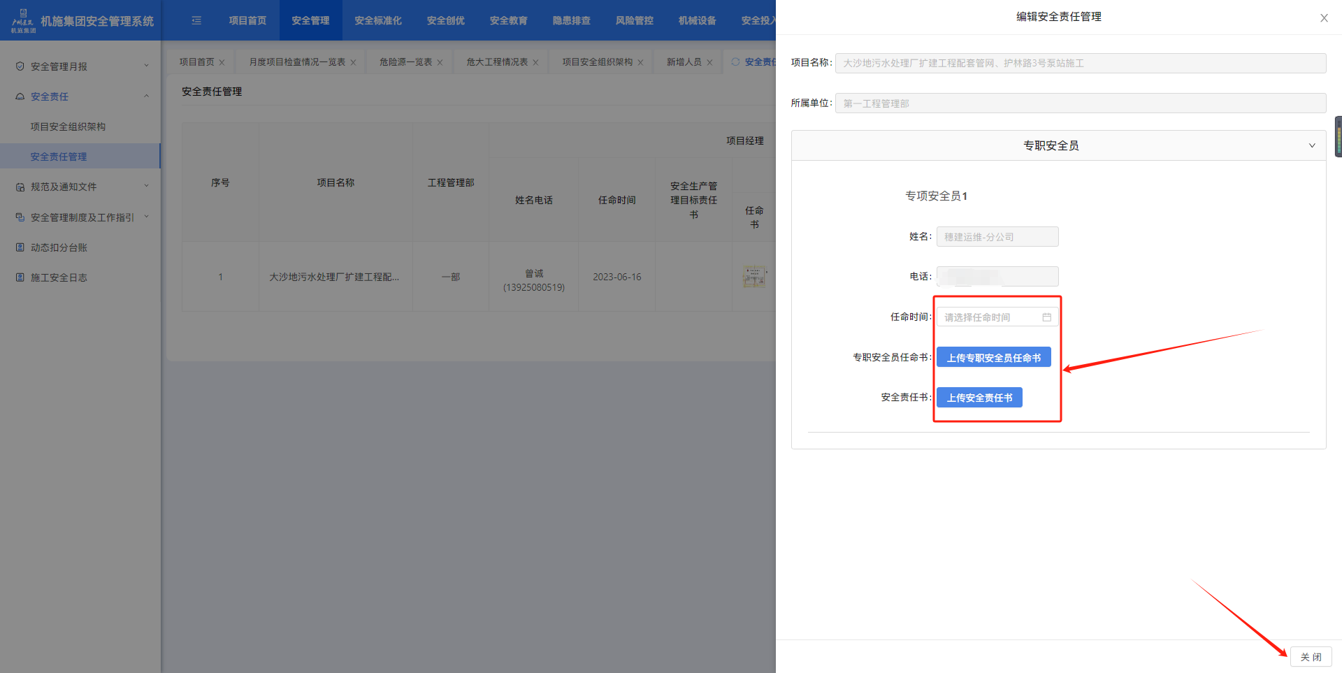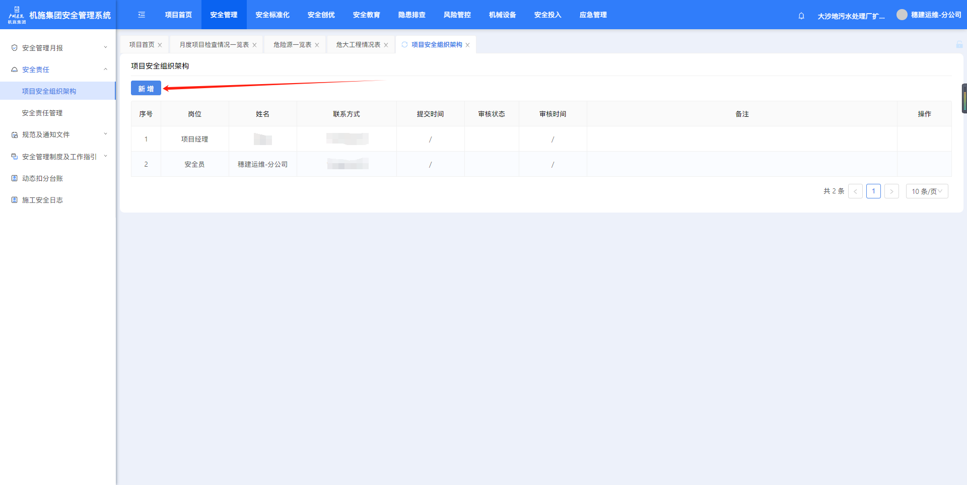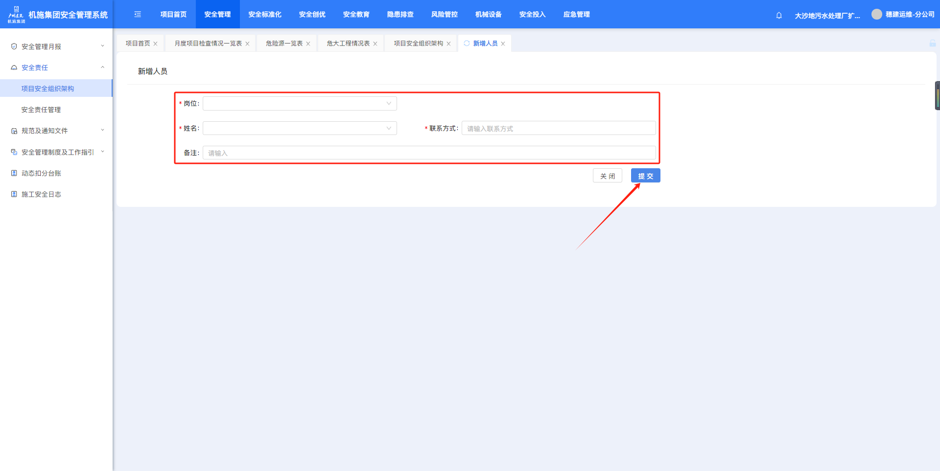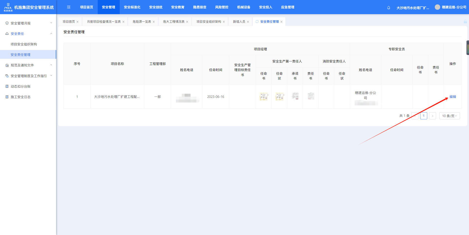 目录 搜索 展开 机施安全部功能操作说明一、安全管理1、项目管理2、安全管理月报3、安全责任4、规范及通知文件5、安全管理制度及工作指引6、企业证件及安全管理机构7、动态扣分台账二、安全标准化三、安全创优1、在建项目安全创优2、项目安全创优台账3、省双优检管理4、创优证书列表四、安全教育1、在线教育设置2、公司年度安全教育3、安全技术交底模板管理及配置五、隐患排查1、安全隐患排查2、安全验收管理六、风险管控七、机械设备八、安全投入九、应急管理十、安全考核十一、安全事故工程管理部功能操作说明一、安全管理1、项目管理2、安全管理月报3、安全责任4、规范及通知文件5、安全管理制度及工作指引6、动态扣分台账二、安全标准化三、安全创优1、在建项目安全创优2、项目安全创优台账3、省双优检管理四、安全教育五、隐患排查1、安全隐患排查2、安全验收管理六、风险管控七、机械设备八、安全投入九、应急管理十、安全考核项目部功能操作说明一、安全管理1、安全管理月报2、安全责任3、规范及通知文件4、安全管理制度及工作指引5、动态扣分台账6、施工安全日志二、安全标准化三、安全创优1、在建项目安全创优2、项目安全创优台账3、省双优检管理四、安全教育五、隐患排查1、安全隐患排查2、安全验收管理六、风险管控七、机械设备八、安全投入九、应急管理 暂无相关搜索结果! 阅读次数:48 本文档使用 MinDoc 发布 2、安全责任 1.2.1.项目安全组织架构“安全责任”-“项目安全组织架构”,点击“新增”新增项目人员。输入项目人员信息,点击“提交”完成新增。 1.2.2.安全责任管理“安全责任”-“安全责任管理”,点击“编辑”打开详情。可以上传任命状等附件。作者:周子艺 创建时间:2024-11-27 15:36最后编辑:周子艺 更新时间:2025-04-22 14:01