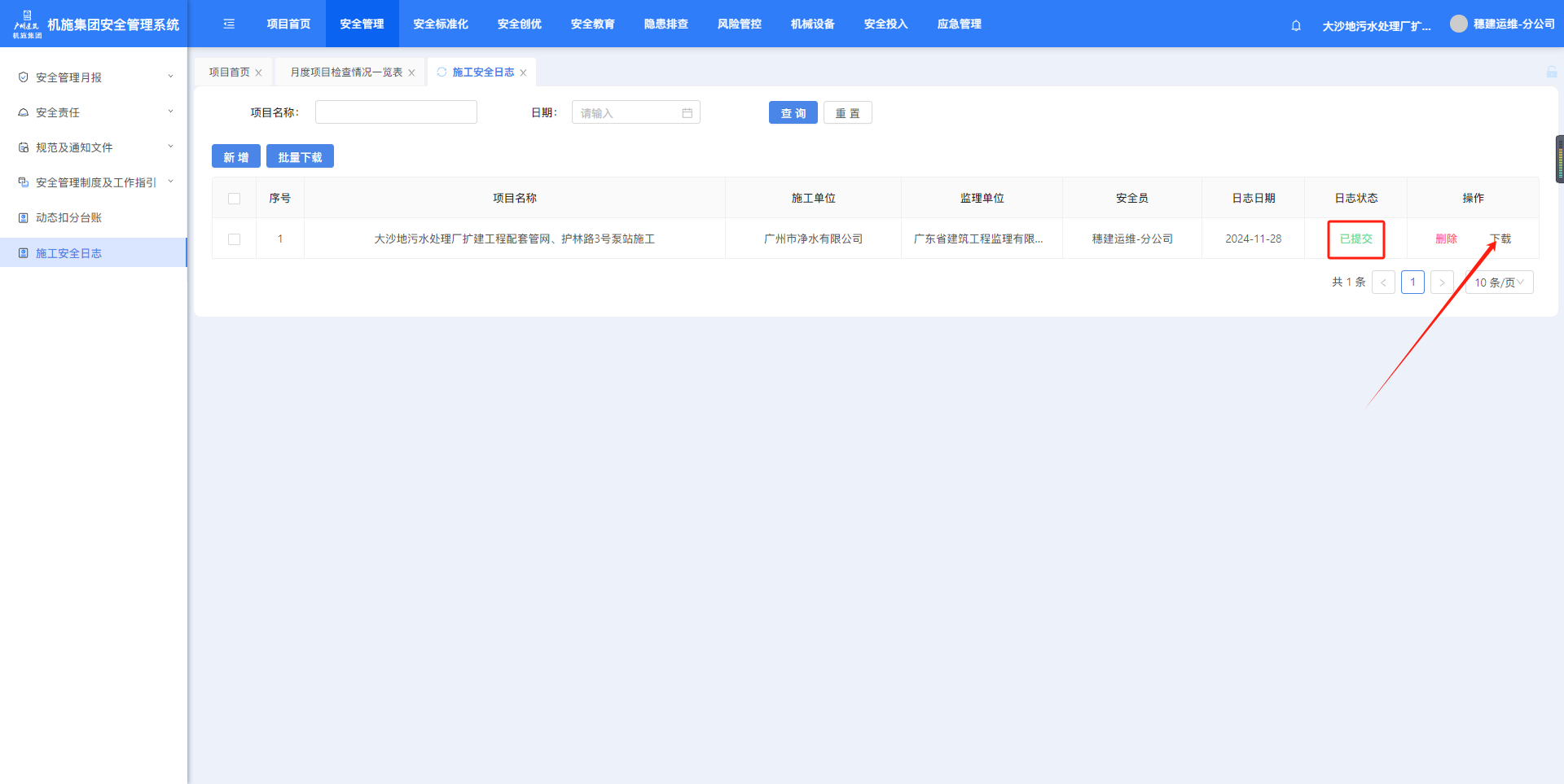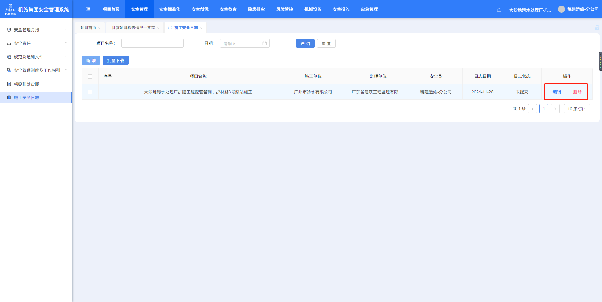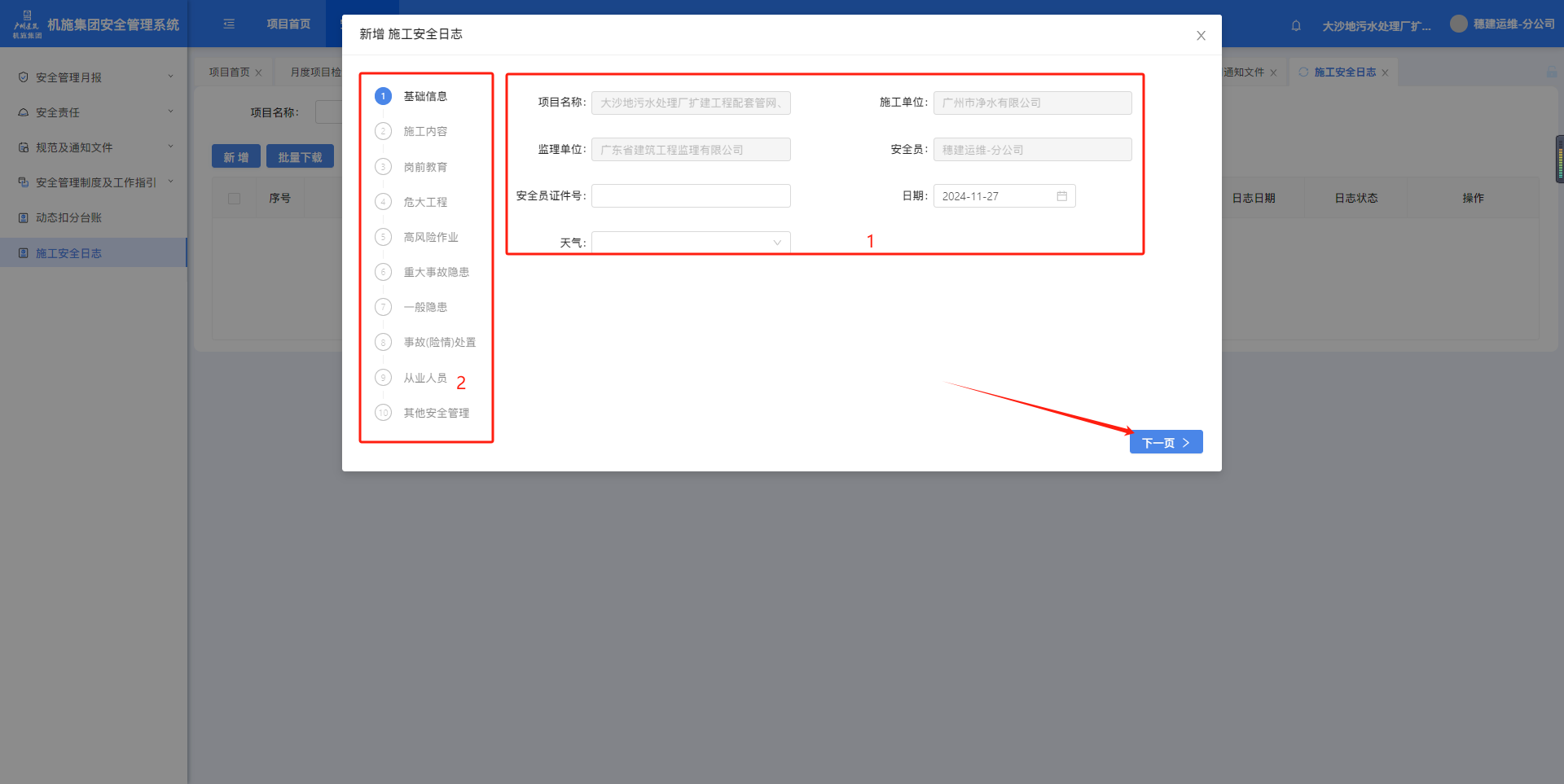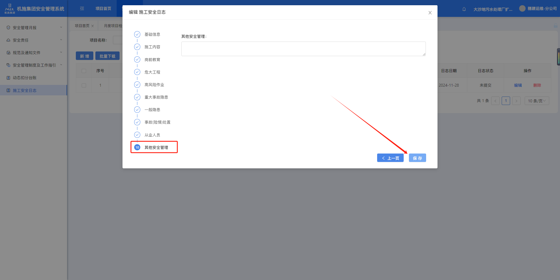 1.6.1.施工安全日志点击菜单进入施工安全日志页面,筛选项目名称、日期,点击【查询】按筛选条件查询。点击【新增】可创建施工安全日志。注意:施工安全日志一天只能创建一条。填写信息,点击【下一页】。填写至最后一页,点击【保存】完成施工安全日志创建。完成填写的施工安全日志,状态会显示已提交,点击【下载】可下载附件。如果施工安全日志没填写完中途退出,状态会显示未提交,点击【编辑】可继续填写。作者:周子艺 创建时间:2024-11-27 15:38最后编辑:周子艺 更新时间:2025-04-22 14:01