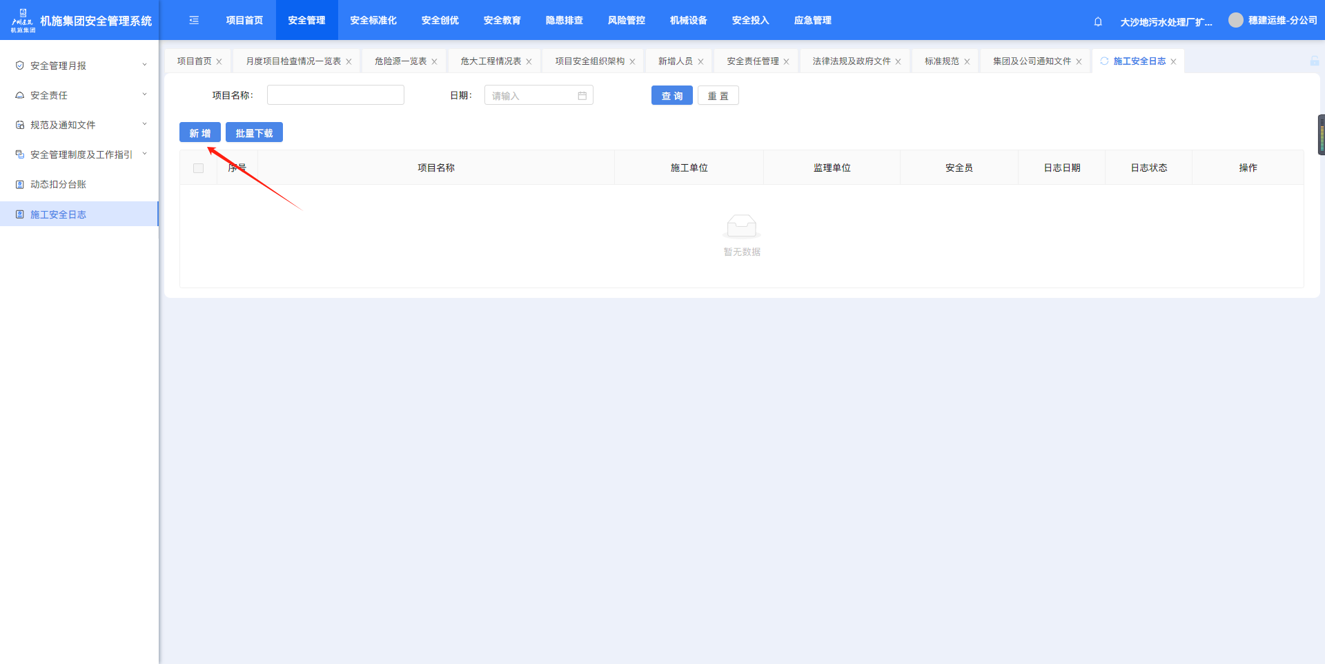 目录 搜索 展开 机施安全部功能操作说明一、安全管理1、项目管理2、安全管理月报3、安全责任4、规范及通知文件5、安全管理制度及工作指引6、企业证件及安全管理机构7、动态扣分台账二、安全标准化三、安全创优1、在建项目安全创优2、项目安全创优台账3、省双优检管理4、创优证书列表四、安全教育1、在线教育设置2、公司年度安全教育3、安全技术交底模板管理及配置五、隐患排查1、安全隐患排查2、安全验收管理六、风险管控七、机械设备八、安全投入九、应急管理十、安全考核十一、安全事故工程管理部功能操作说明一、安全管理1、项目管理2、安全管理月报3、安全责任4、规范及通知文件5、安全管理制度及工作指引6、动态扣分台账二、安全标准化三、安全创优1、在建项目安全创优2、项目安全创优台账3、省双优检管理四、安全教育五、隐患排查1、安全隐患排查2、安全验收管理六、风险管控七、机械设备八、安全投入九、应急管理十、安全考核项目部功能操作说明一、安全管理1、安全管理月报2、安全责任3、规范及通知文件4、安全管理制度及工作指引5、动态扣分台账6、施工安全日志二、安全标准化三、安全创优1、在建项目安全创优2、项目安全创优台账3、省双优检管理四、安全教育五、隐患排查1、安全隐患排查2、安全验收管理六、风险管控七、机械设备八、安全投入九、应急管理 暂无相关搜索结果! 阅读次数:67 本文档使用 MinDoc 发布 6、施工安全日志 1.6.1.施工安全日志点击菜单进入施工安全日志页面,筛选项目名称、日期,点击【查询】按筛选条件查询。点击【新增】可创建施工安全日志。注意:施工安全日志一天只能创建一条。填写信息,点击【下一页】。填写至最后一页,点击【保存】完成施工安全日志创建。完成填写的施工安全日志,状态会显示已提交,点击【下载】可下载附件。如果施工安全日志没填写完中途退出,状态会显示未提交,点击【编辑】可继续填写。作者:周子艺 创建时间:2024-11-27 15:38最后编辑:周子艺 更新时间:2025-04-22 14:01