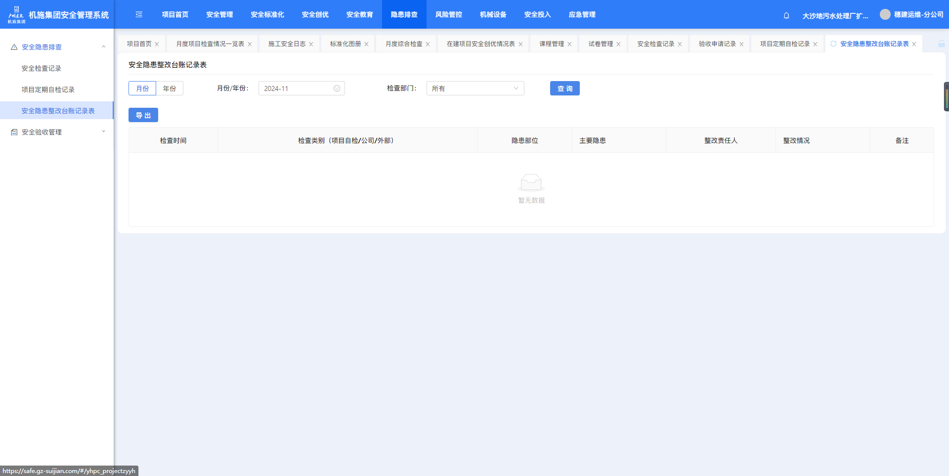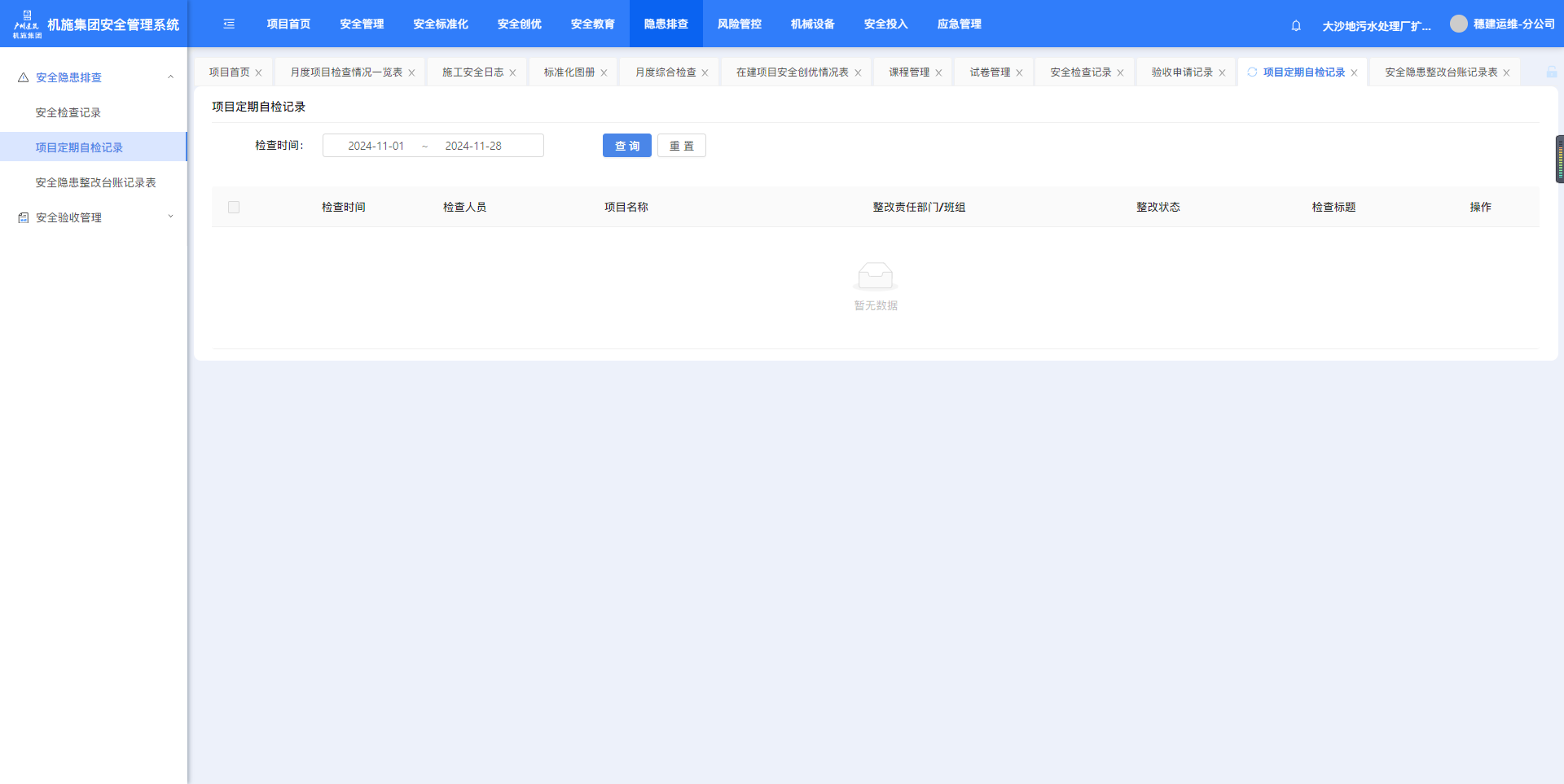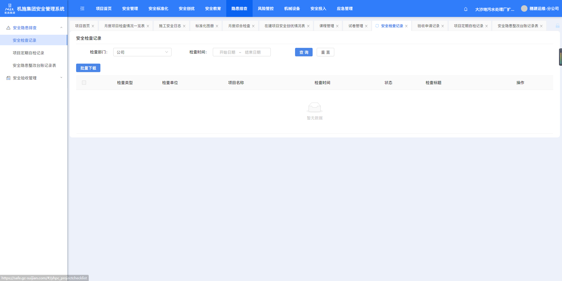 5.1.1.安全检查记录“安全隐患排查”-“安全检查记录”,点击“批量下载”可下载勾选项的附件。 5.1.2.项目定期自检记录“安全隐患排查”-“项目定期自检记录” 5.1.3.安全隐患整改台账记录表“安全隐患排查”-“安全隐患整改台账记录表”,按条件筛选,点击“导出”可导出台账。作者:周子艺 创建时间:2024-11-28 11:04最后编辑:周子艺 更新时间:2025-04-22 14:01