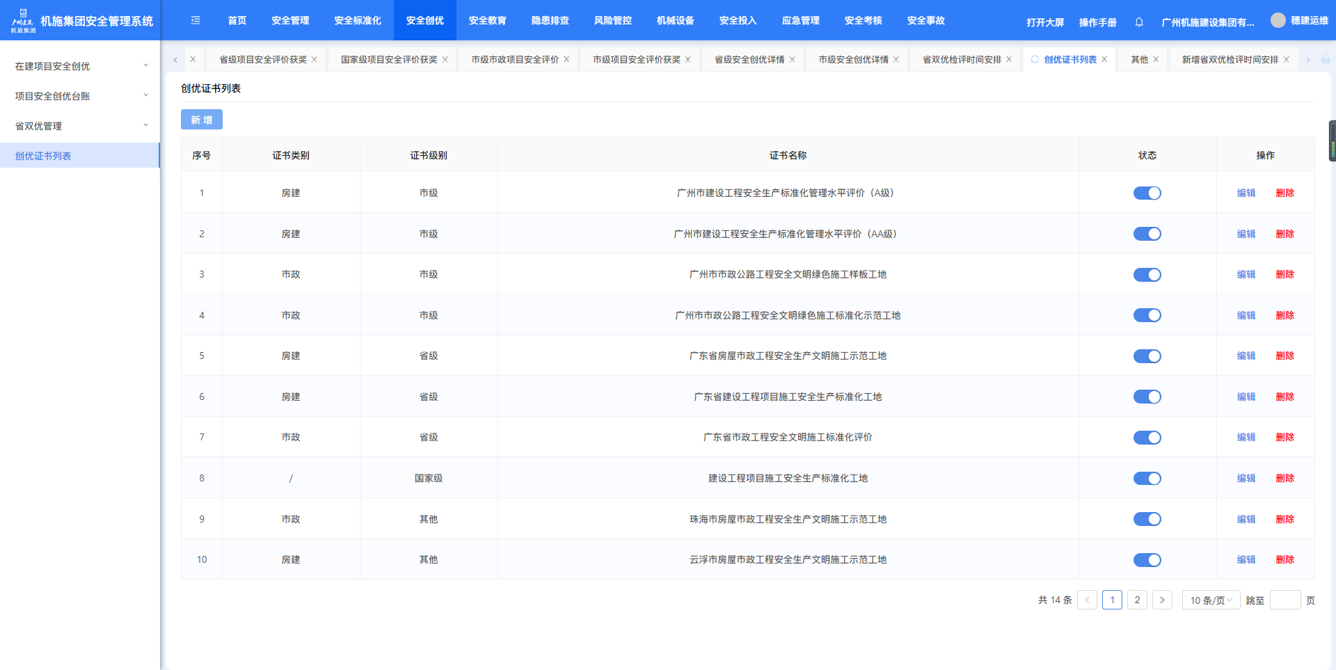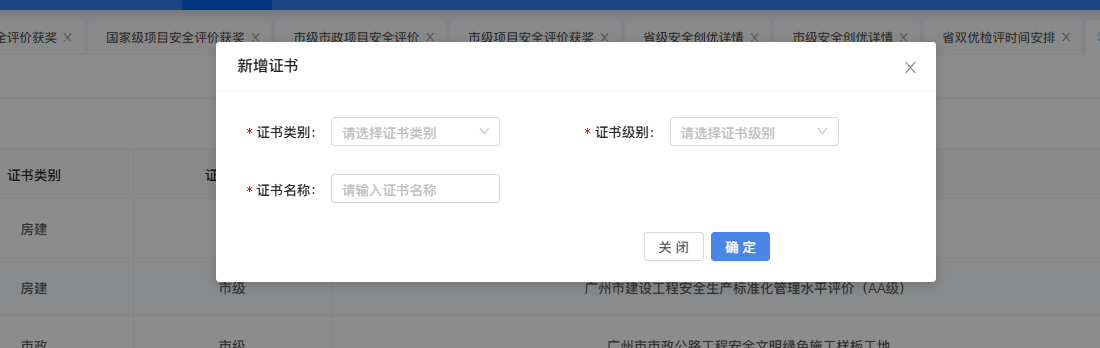 目录 搜索 展开 机施安全部功能操作说明一、安全管理1、项目管理2、安全管理月报3、安全责任4、规范及通知文件5、安全管理制度及工作指引6、企业证件及安全管理机构7、动态扣分台账二、安全标准化三、安全创优1、在建项目安全创优2、项目安全创优台账3、省双优检管理4、创优证书列表四、安全教育1、在线教育设置2、公司年度安全教育3、安全技术交底模板管理及配置五、隐患排查1、安全隐患排查2、安全验收管理六、风险管控七、机械设备八、安全投入九、应急管理十、安全考核十一、安全事故工程管理部功能操作说明一、安全管理1、项目管理2、安全管理月报3、安全责任4、规范及通知文件5、安全管理制度及工作指引6、动态扣分台账二、安全标准化三、安全创优1、在建项目安全创优2、项目安全创优台账3、省双优检管理四、安全教育五、隐患排查1、安全隐患排查2、安全验收管理六、风险管控七、机械设备八、安全投入九、应急管理十、安全考核项目部功能操作说明一、安全管理1、安全管理月报2、安全责任3、规范及通知文件4、安全管理制度及工作指引5、动态扣分台账6、施工安全日志二、安全标准化三、安全创优1、在建项目安全创优2、项目安全创优台账3、省双优检管理四、安全教育五、隐患排查1、安全隐患排查2、安全验收管理六、风险管控七、机械设备八、安全投入九、应急管理 暂无相关搜索结果! 阅读次数:131 本文档使用 MinDoc 发布 4、创优证书列表 1.创优证书列表点击菜单进入省双优检评时间安排页面,筛选工程管理部、项目名称、日期、检评性质,点击【查询】按筛选条件查询。点击【新增】添加证书。选择证书类型、证书级别,填写证书名称,点击【确定】完成新增。作者:周子艺 创建时间:2025-04-18 15:29最后编辑:周子艺 更新时间:2025-04-22 14:01