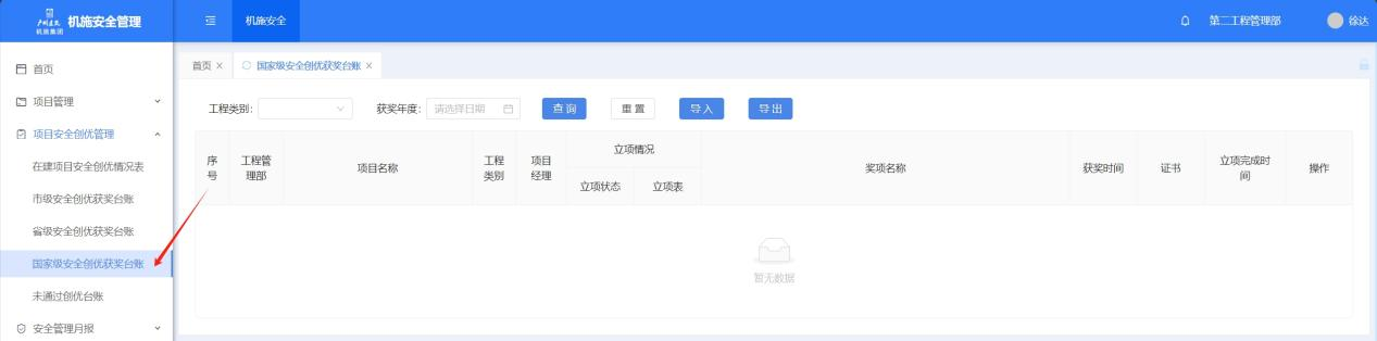 点击菜单进入国家级安全创优获奖页面,筛选工程类别、获奖年度,点击【查询】按筛选条件查询。支持【导入】外部文件,点击【导出】可以导出台账。点击【编辑】进入国家级安全创优获奖台账编辑页面。
