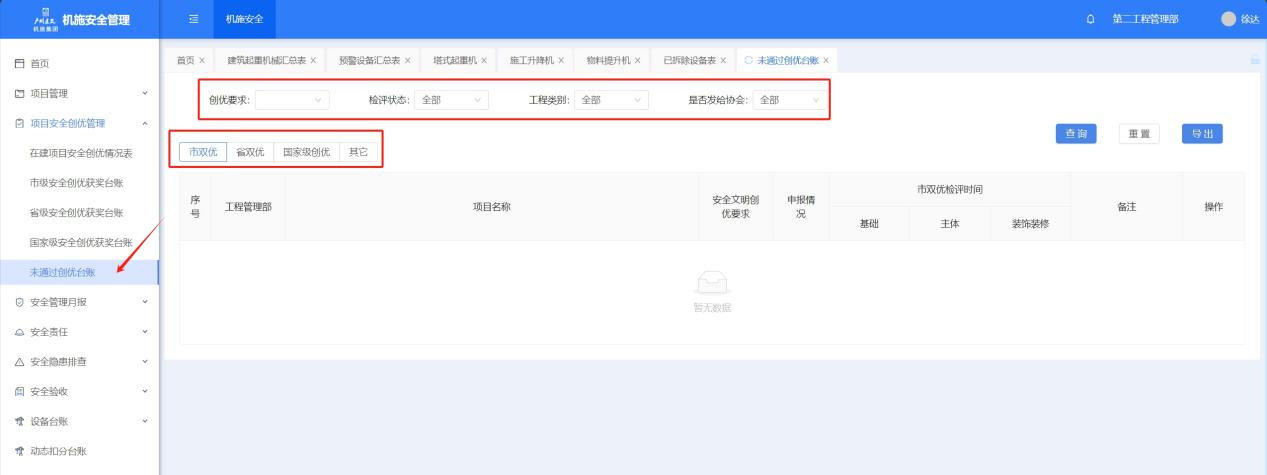点击菜单进入未通过创优台账页面,筛选创优要求、检评状态、工程类别、是否发给协会,点击【查询】按筛选条件查询。按市双优、省双优、国家级创优和其他分类展示,点击【导出】可以导出台账。点击【编辑】进入未通过创优台账编辑页面。