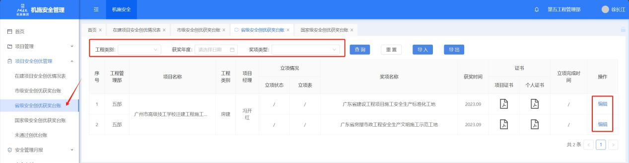 点击菜单进入省级安全创优获奖页面,筛选工程类别、获奖年度、奖项类型,点击【查询】按筛选条件查询。支持【导入】外部文件,点击【导出】可以导出台账。点击【编辑】进入省级安全创优获奖台账编辑页面。