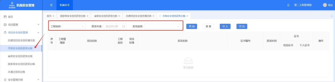 点击菜单进入市级安全创优获奖页面,筛选工程类别、获奖年度,奖项类型,点击【查询】按筛选条件查询。支持【导入】外部文件,点击【导出】可以导出台账。点击【编辑】进入市级安全创优获奖台账编辑页面。