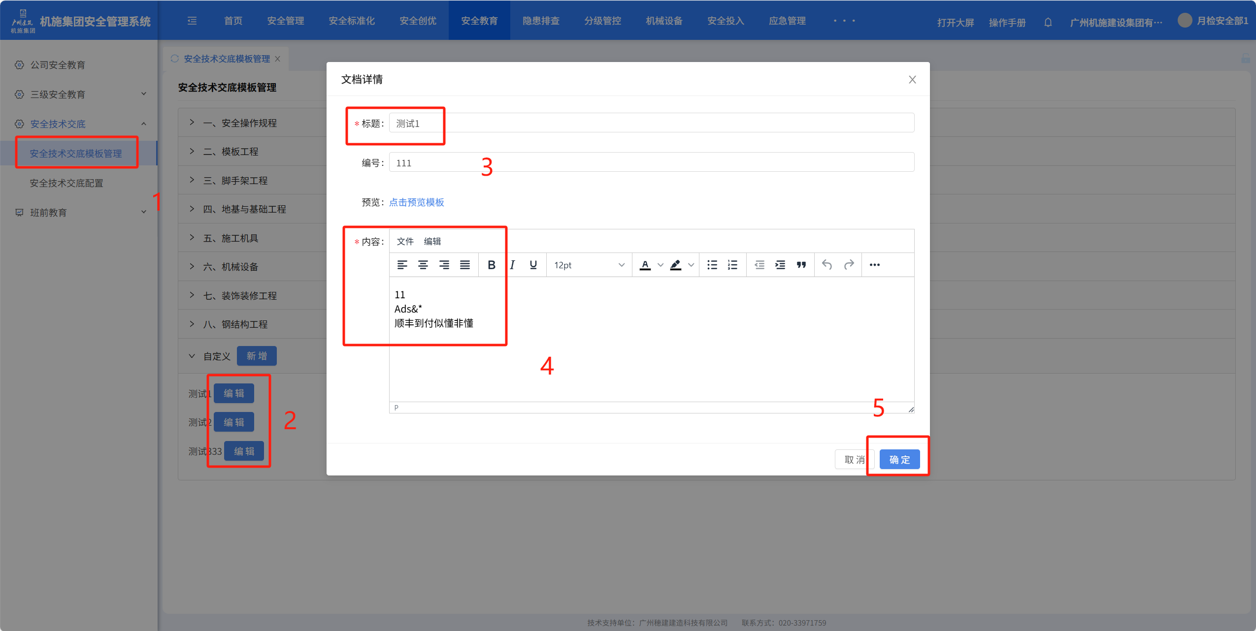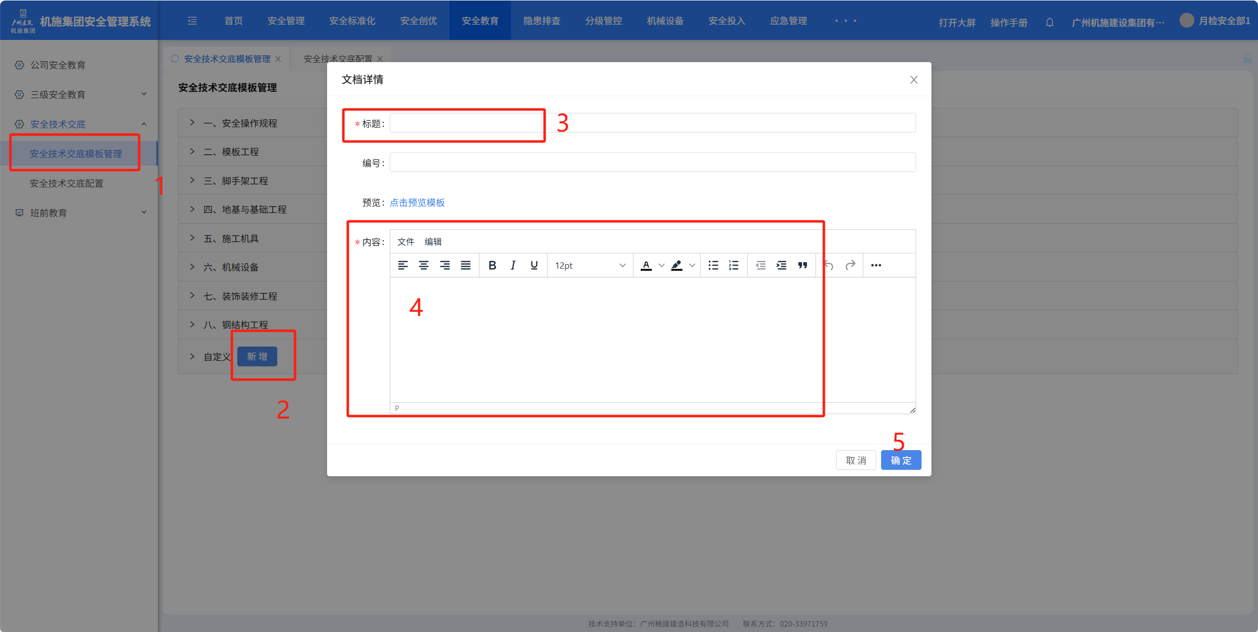 1.安全技术交底模板管理:前八个模块为标准模块,只可查看不支持修改。