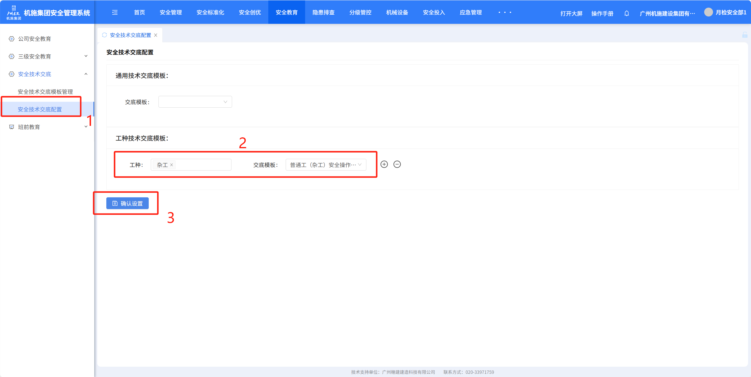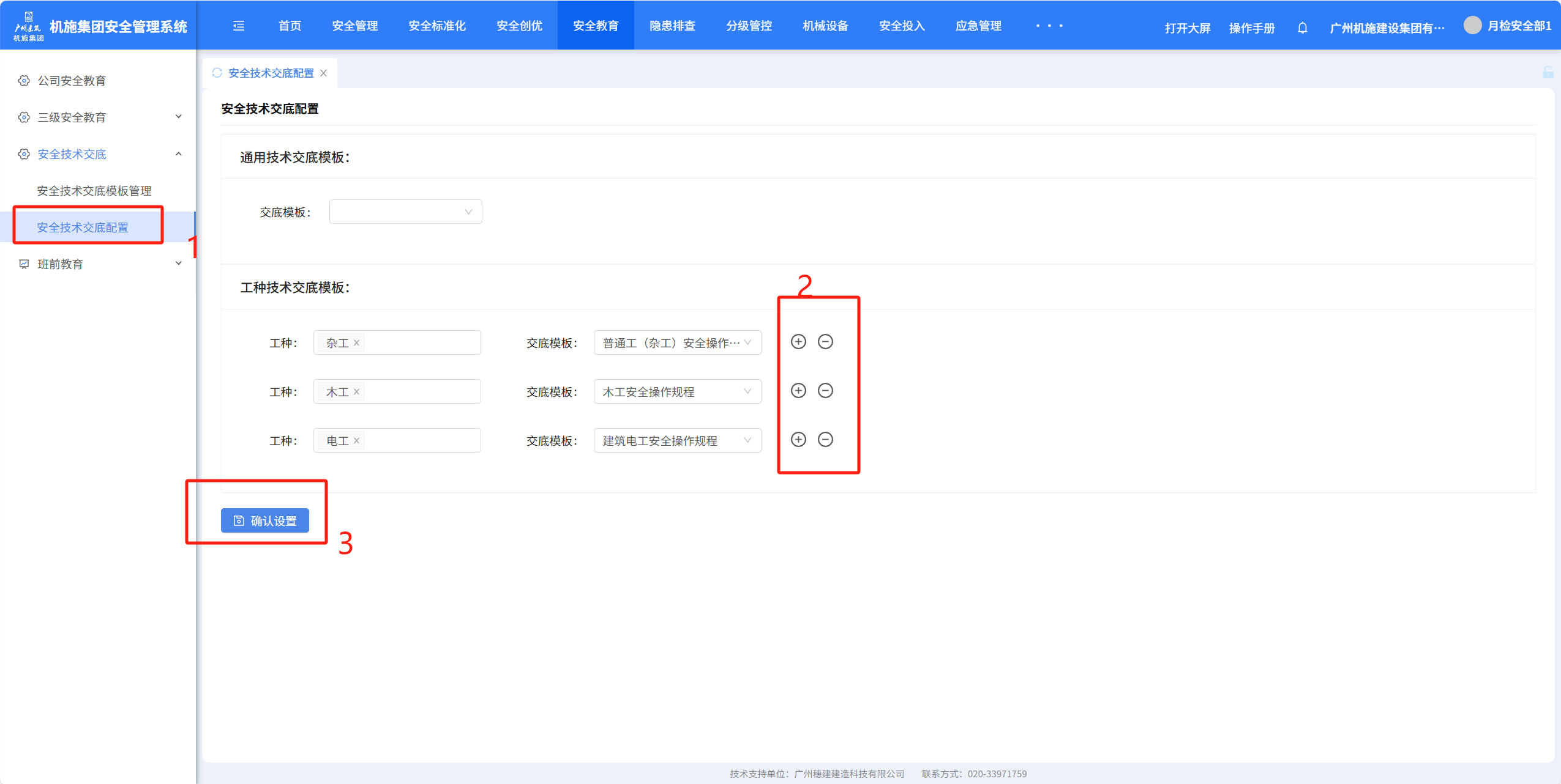 (4)点击【确认配置】,完成入场技术交底模板配置,工人扫码进场后,系统根据工人入场选择的工种推送对应的入场安全技术交底资料。